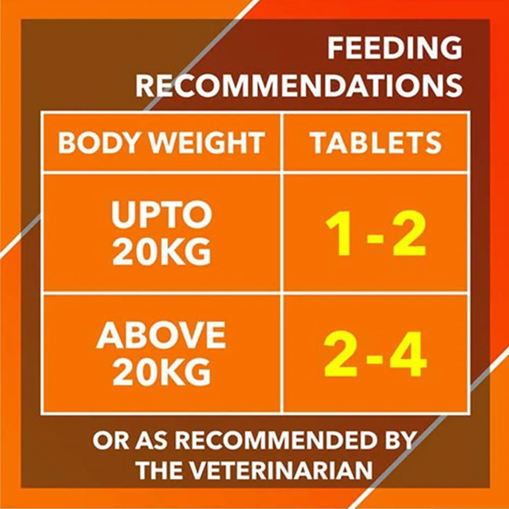 1 to 2 tablets can be given up to 20 kg body weight, and 2 to 4 tablets can be given for more than 20 kg body weight or serve as recommended by the Veterinarian.Direction of Use