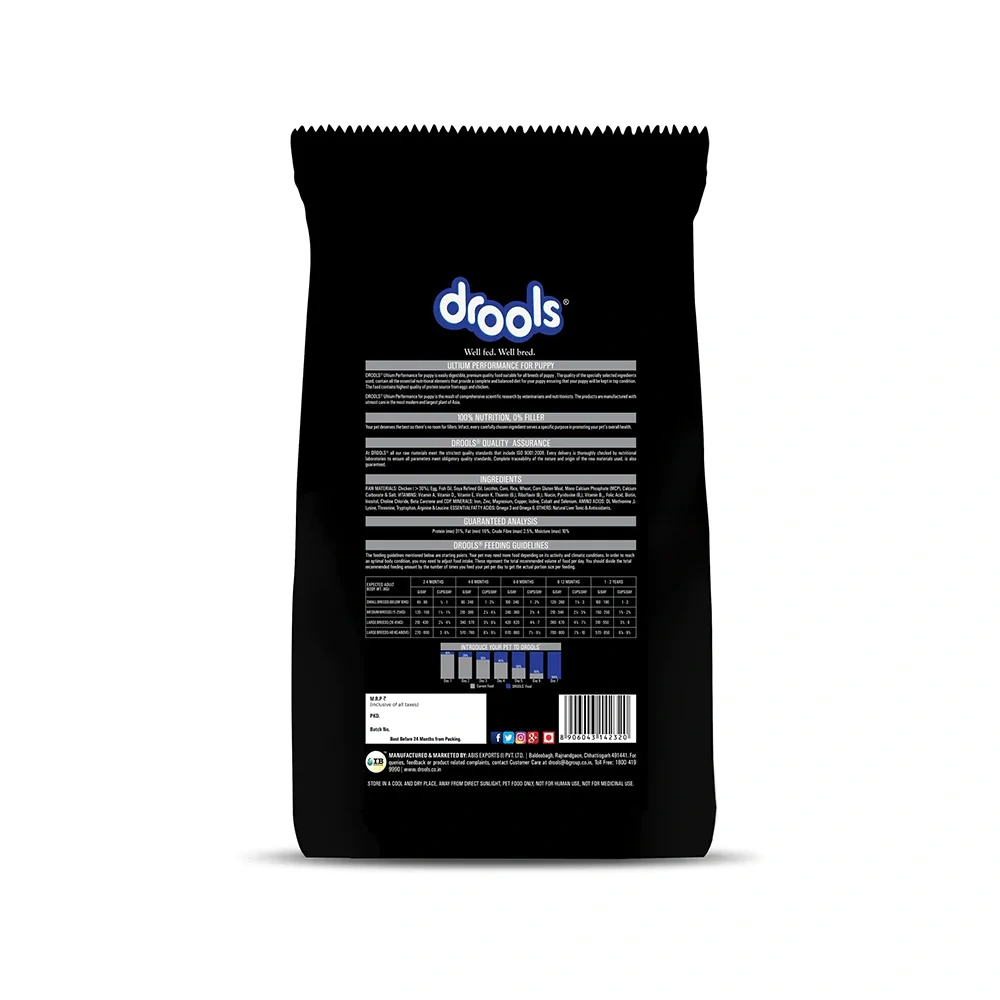 Drools Ultium Performance Adult Dog Food is formulated with higher protein and fat for peak performance, and promoting superior growth and muscle development of your dog. Easily digestible with high quality ingredients, it provides a complete and balanced diet for dogs making them agile and active. In addition to being gut friendly it also supports optimum absorption by your pet. It is enriched with mycosorb, bioplex and yea sacc for better results and improved performance.Key Features