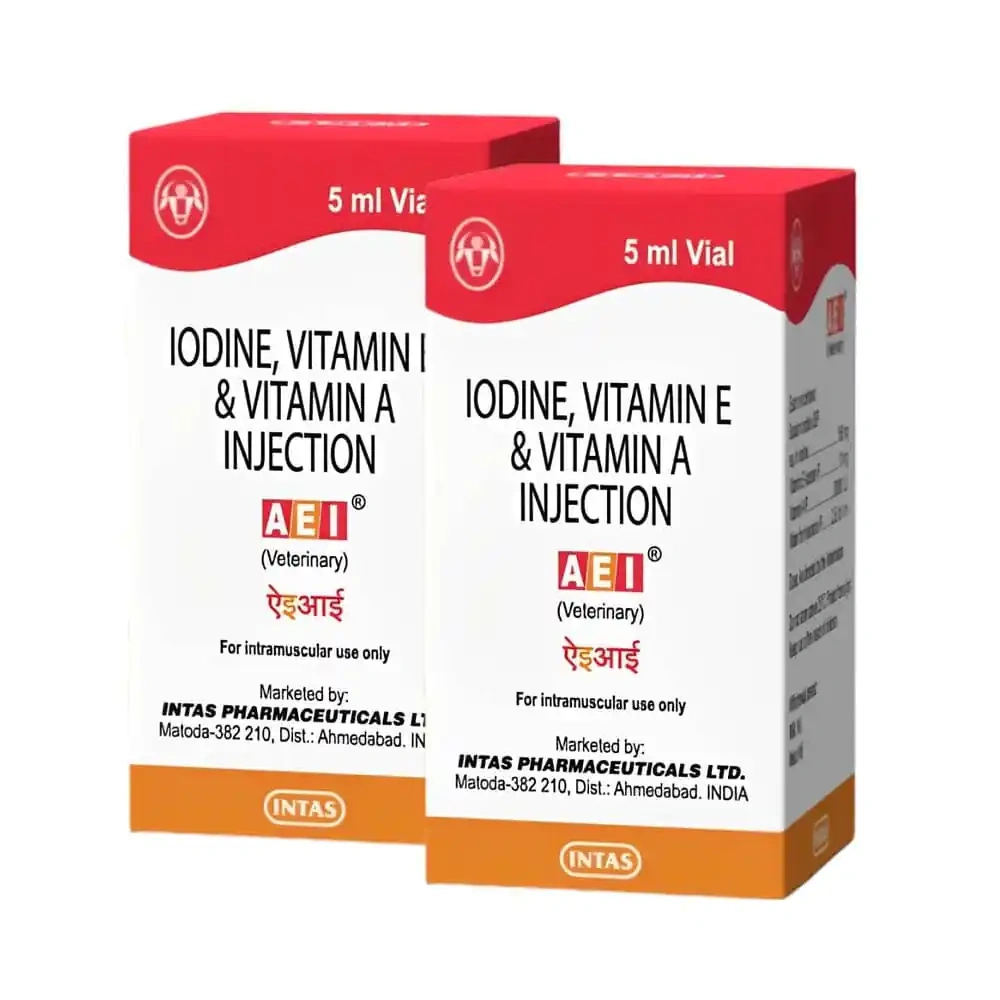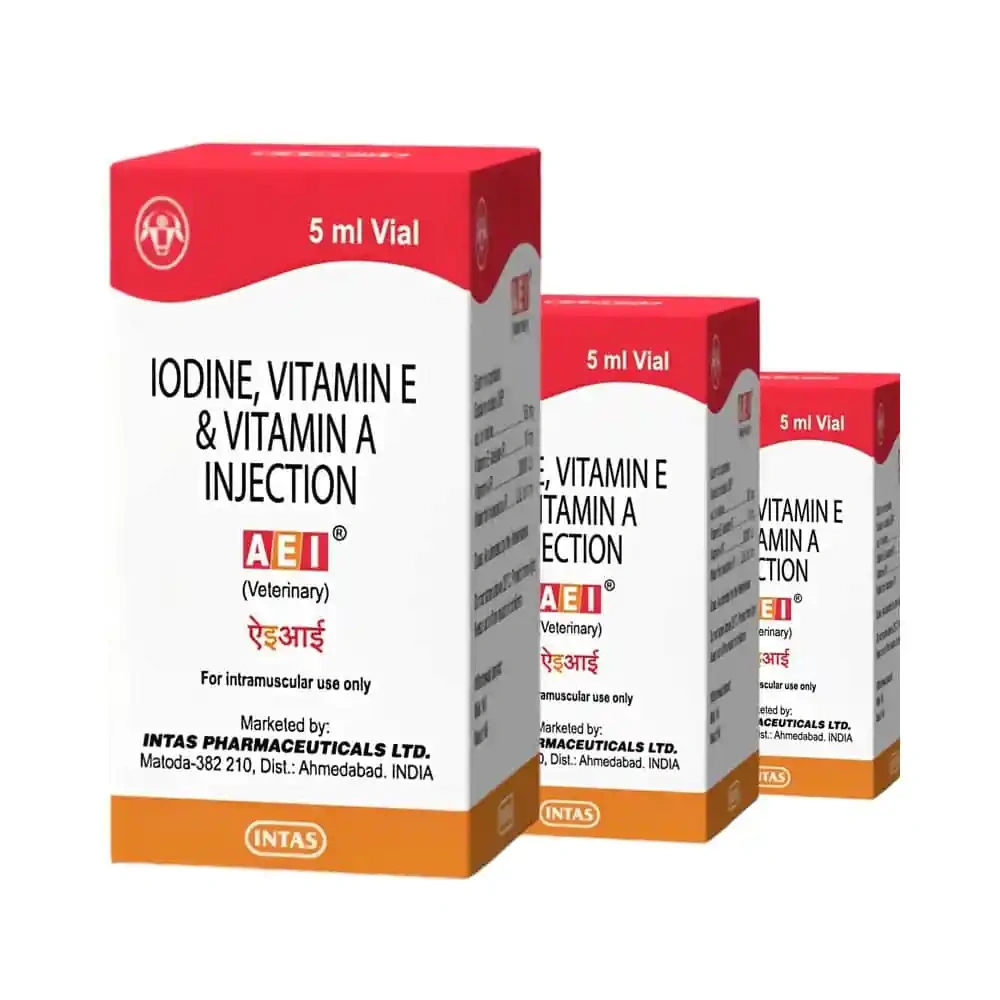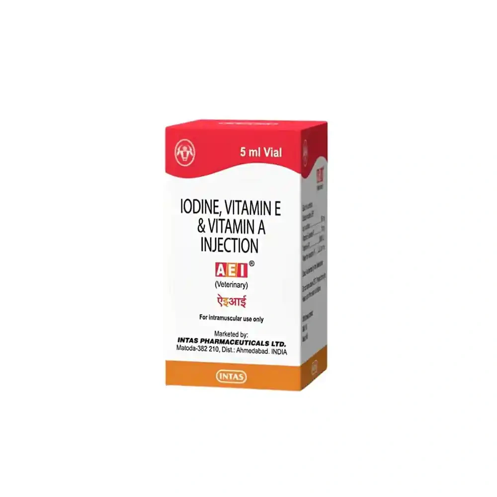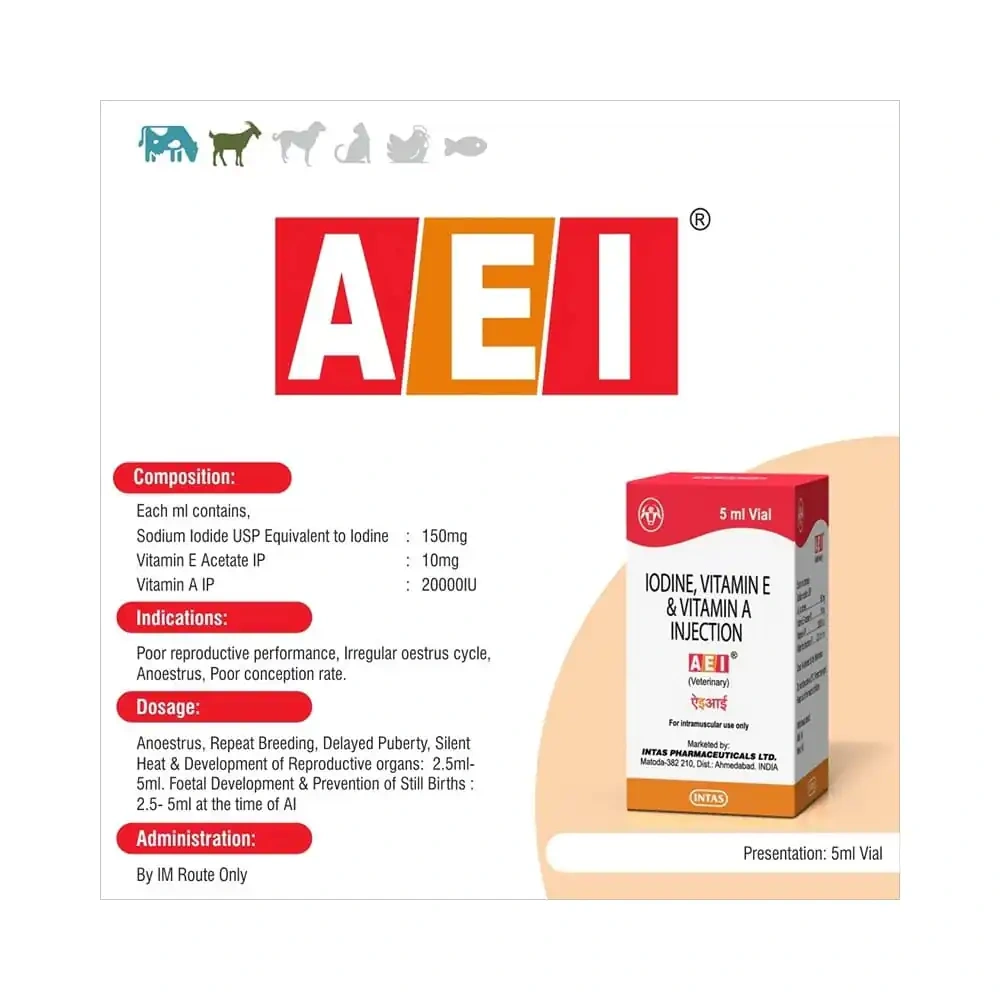 - Detailed Description: AEI Injection is specially formulated to support the reproductive health of animals. It contains sodium iodide, vitamin E acetate, and vitamin A, which work together to improve reproductive performance, regularize oestrus cycles, and enhance conception rates. This injection is particularly beneficial for addressing delayed puberty, silent heat, and the development of reproductive organs.