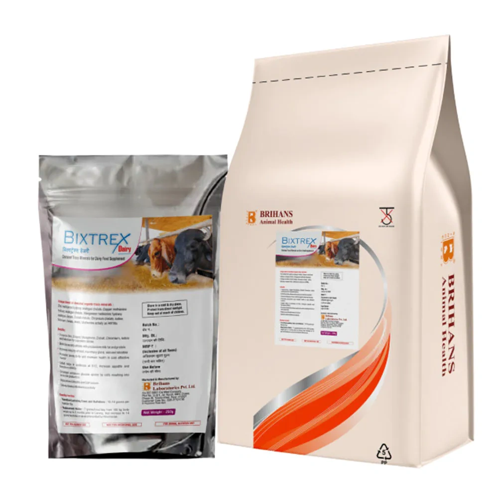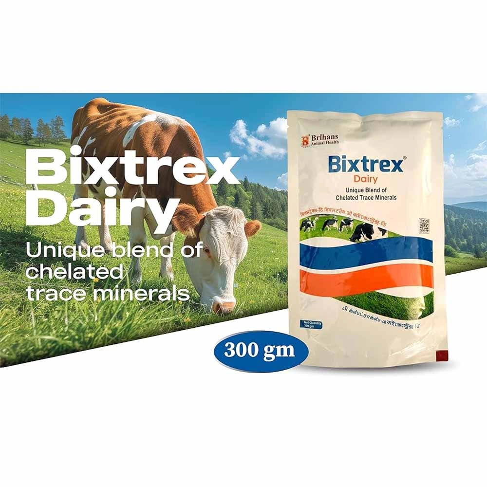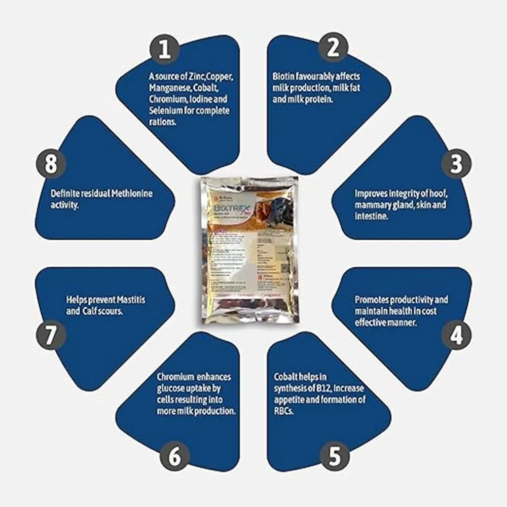 Bixtrex Dairy, is an advanced mineral supplement designed to meet the nutritional needs of dairy livestock. Each 14 grams of Bixtrex Dairy provides a balanced mix of essential minerals and vitamins that are vital for maintaining health and enhancing productivity in cows and buffaloes. This supplement is particularly beneficial during the transition and lactation periods, promoting optimal milk production and overall well-being.Key Features