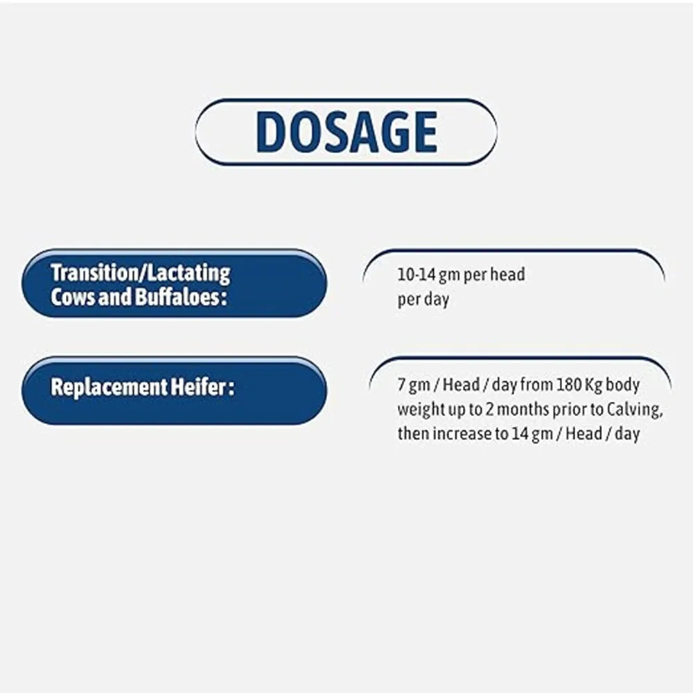 - Replacement Heifer: 7 gm/Head/day from 180 Kg body weight up to 2 months prior to Calving, then increase to 14 gm/Head/day
