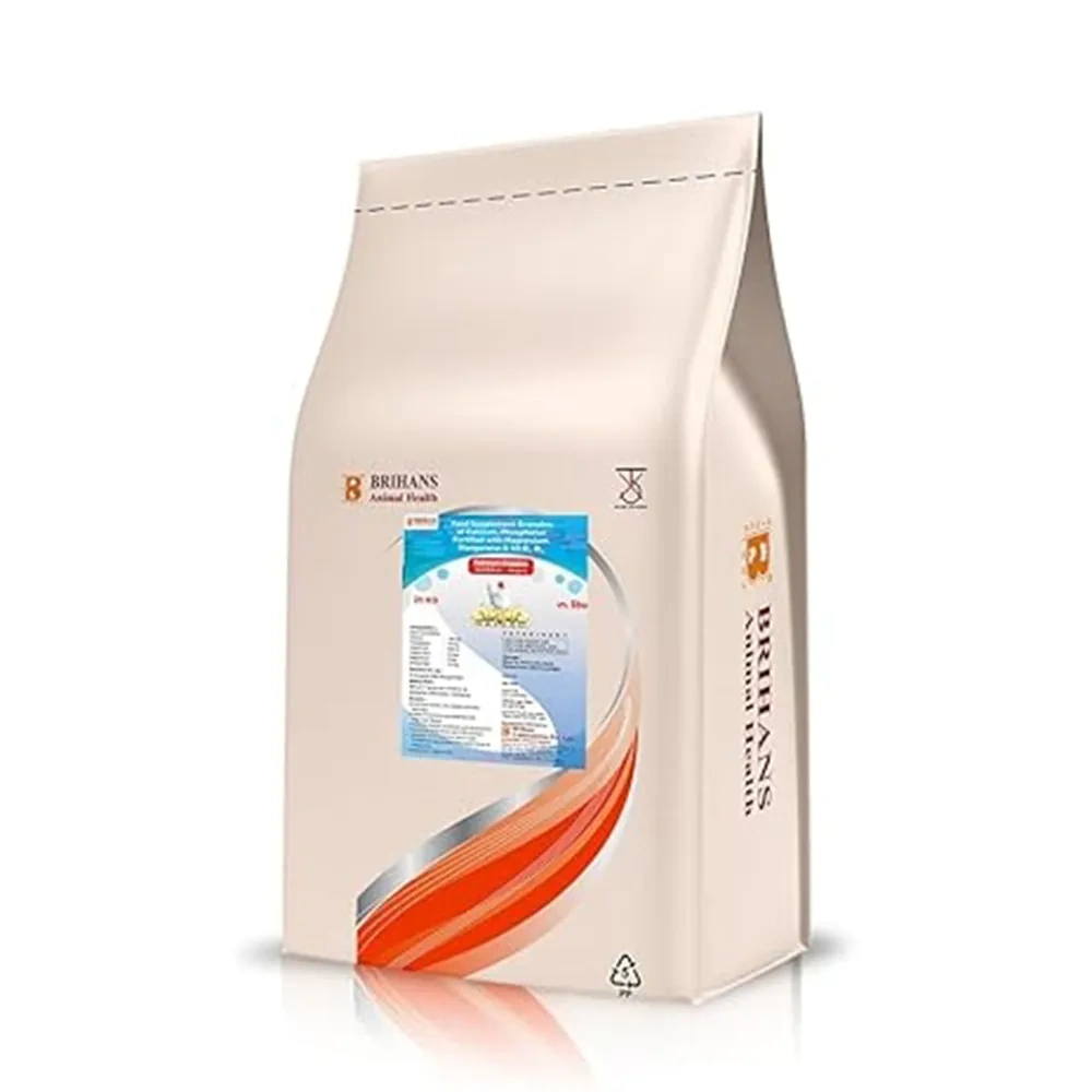 Brihans Animal Health’s Calcicare Granules Feed Supplement offers a mixture of calcium and phosphorus that is essential for poultry birds’ health and productivity, as both minerals play critical roles in bone development, eggshell formation, muscle function, and overall metabolism.Key Ingredients