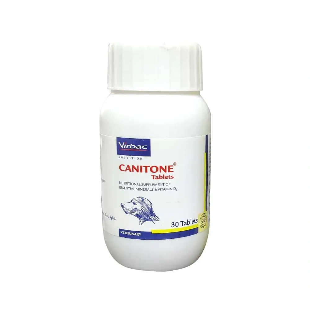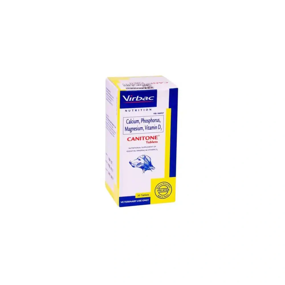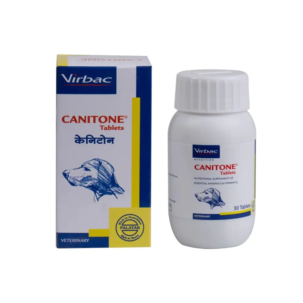 Virbac Canitone Tablets For Dogs is a complete and balanced vitamin-mineral supplement, essential for better absorption of Calcium in dogs with mineral deficiencies. Key Ingredients: Each tablet contains: Calcium – 700mg Phosphorus – 400mg Magnesium – 0.5mg Vitamin D3 – 400 IU Class: Calcium supplement Indications/Uses: Joint mobility: Supports sustained joint mobility and movement in your pets. For optimal bone health: Meets your pet’s growing needs during pregnancy and lactation. Easy to feed: Offers excellent palatability for pets. Fights joint disorders: Helps prevent and manage joint disorders in dogs and cats. Breed type: Suitable for all breeds of cats and dogs. Dosage: For adult pets: 1-2 tablets daily Key Benefits: CANITONE® Tablets play a crucial role in pet health by supporting the development and maintenance of strong bones. It is particularly beneficial for adult dogs, supporting their active lifestyle and overall well-being. This supplement ensures your furry friend receives all the necessary nutrients for a vibrant life. Directions for use: As recommended by the veterinarian. Suitable for Dogs and Cats. Precautions: N/A