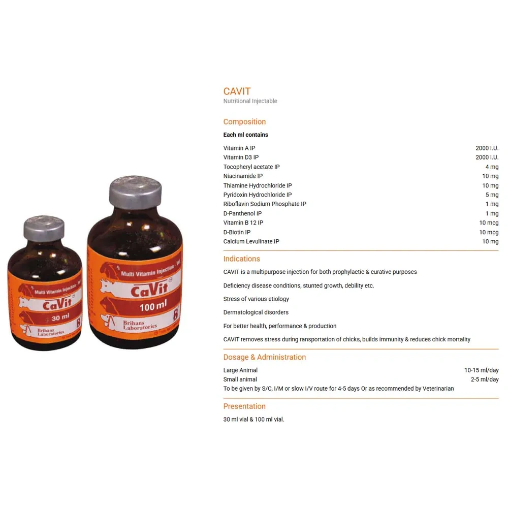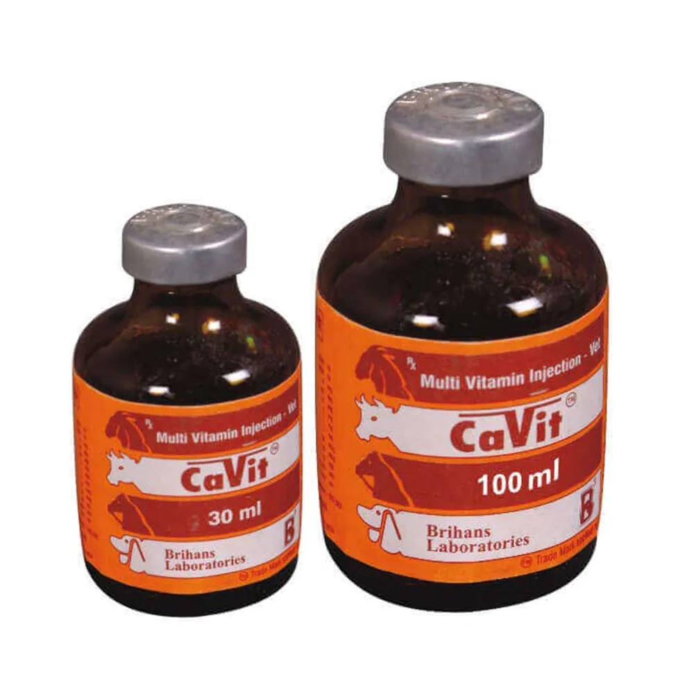 Brihans Cavit is a multipurpose nutritional injectable designed for both prophylactic and curative applications in animals. Each milliliter contains a comprehensive blend of essential vitamins and minerals, including Vitamins A, D3, E (Tocopheryl acetate), B1 (Thiamine Hydrochloride), B2 (Riboflavin Sodium Phosphate), B6 (Pyridoxine Hydrochloride), B12, Niacinamide, D-Panthenol, D-Biotin, and Calcium Levulinate. This formulation addresses deficiency diseases, supports growth, alleviates debility, and reduces stress from various etiologies. It’s also beneficial for dermatological disorders and enhances overall health, performance, and production.