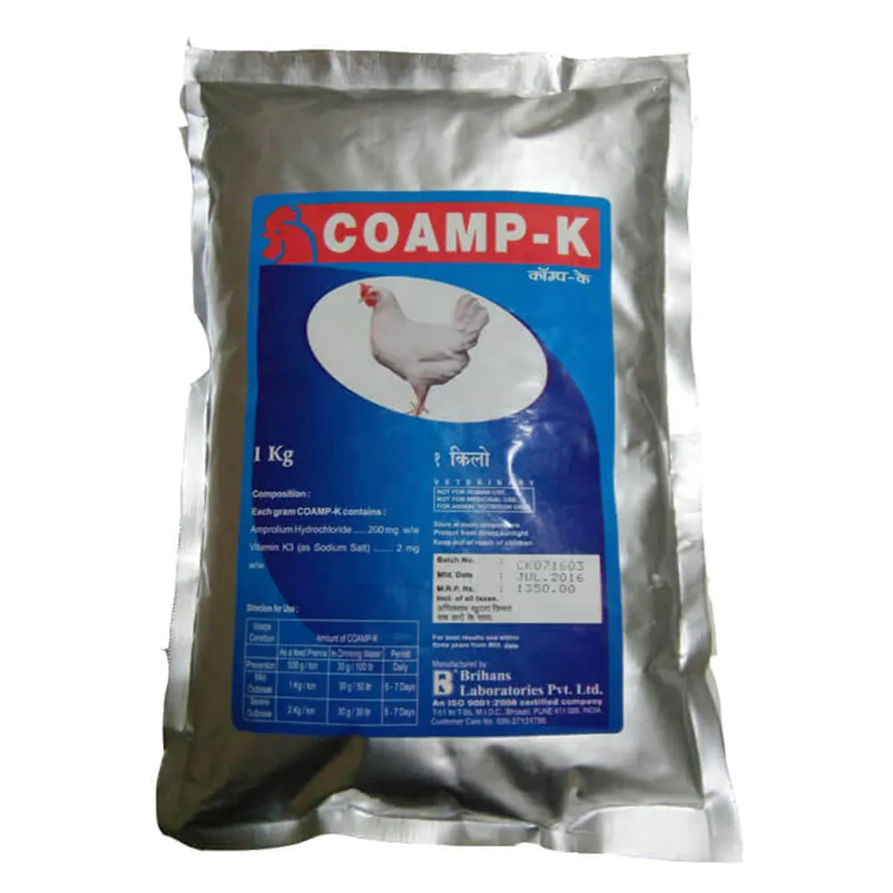 Brihans Coamp-K is a specialized poultry feed supplement designed for the prevention and treatment of coccidiosis, a disease caused by various Eimeria species. Its main ingredient, Amprolium Hydrochloride (200 mg per gram), effectively combats coccidiosis by inhibiting the parasite’s ability to utilize thiamine, which is essential for its growth and survival. Additionally, the supplement contains Vitamin K3 (2 mg per gram), which supports blood clotting and helps reduce the risk of blood loss caused by intestinal damage during coccidiosis. Brihans Coamp-K is typically administered through feed or drinking water, offering a practical solution for both prevention and management of coccidiosis in poultry.