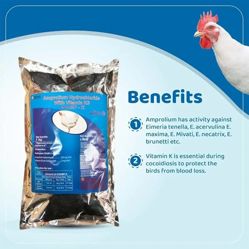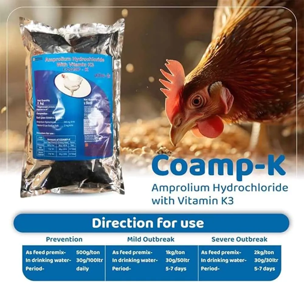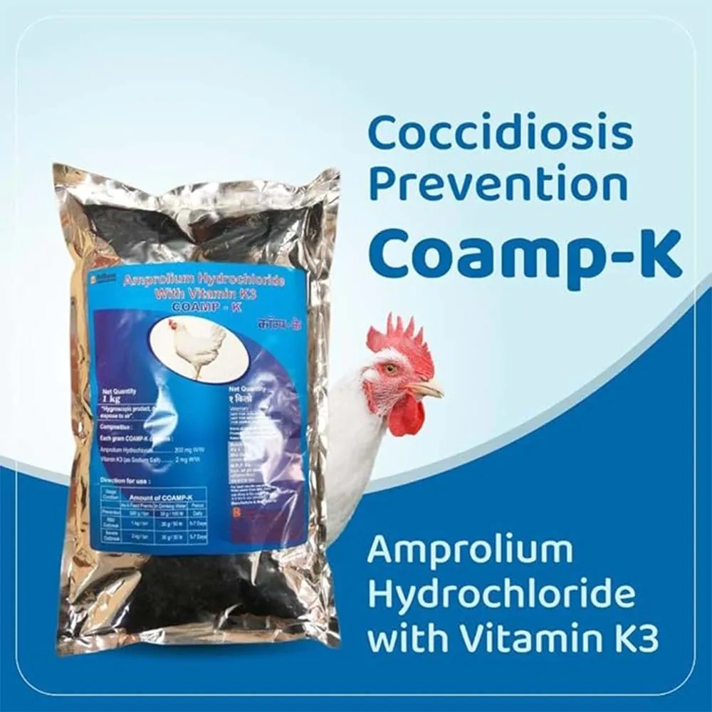 Brihans Animal Health’s Coamp-K contains Amprolium Hydrochloride, an anticoccidial agent effective against Eimeria parasites, with Vitamin K3, which plays a crucial role in blood clotting and can help mitigate the effects of blood loss associated with coccidiosis infections. Together, these ingredients provide a comprehensive solution for the prevention and treatment of coccidiosis in poultry.