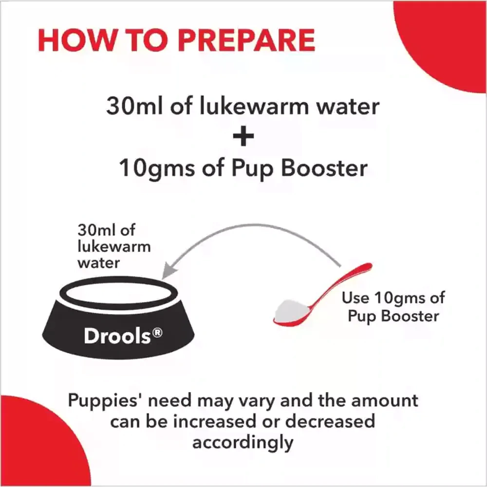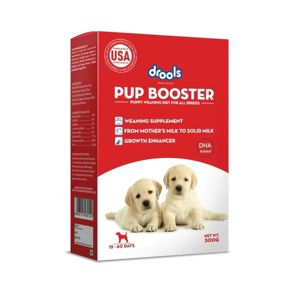 Drools Pup Booster Puppy Weaning Diet for All Breeds is formulated to provide healthy balanced nutrition to puppies of all breeds. This product has all the required necessities for a healthy growth and development. It works in introducing semi-solid food other than mother’s milk after separation of the pup from the mother. It is rich in DHA, protein, probiotics and prebiotics. The formula is used for 15 days to 2 months old puppies.