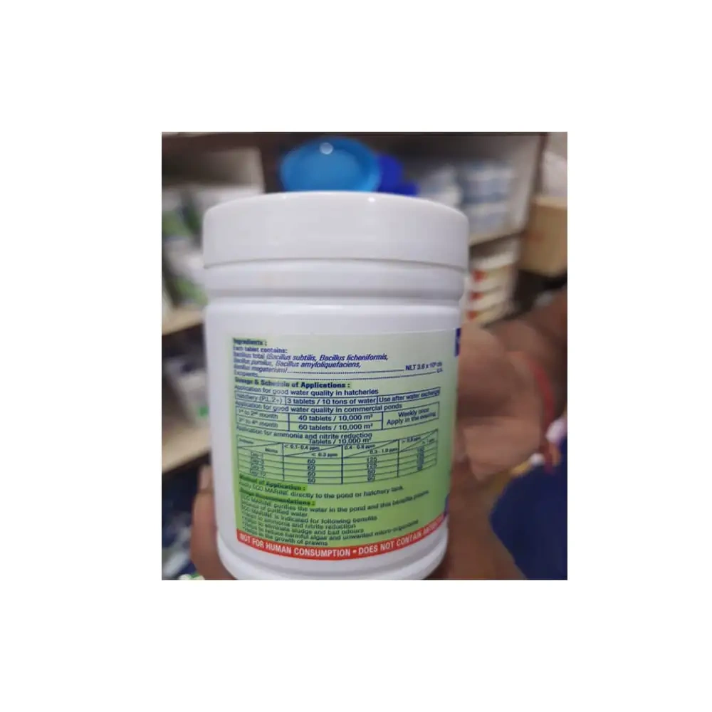 Fish and Prawn: 40 tablets for one hectare of one-meter water depth of pond every 15 days. Eco Marine™ Tablets help in the digestion of organic waste and convert it into micronutrients and reduce toxic gases. Recommended for Doctors, hospitals, and Registered Medical Practitioners.