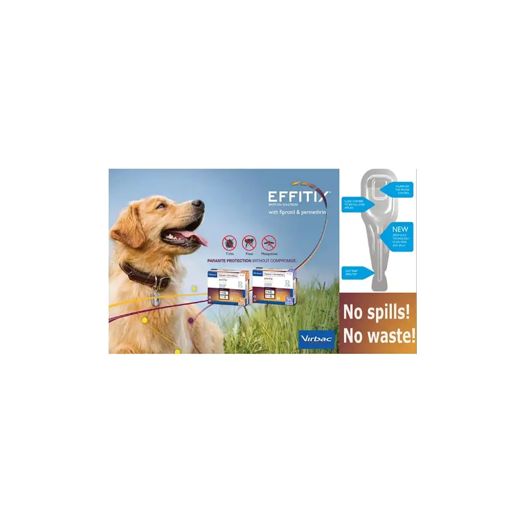 Fleas, ticks, and lice (biting and chewing) infestations can be controlled with monthly applications of EFFITIX Topical Solutions for Dogs. Biting flies and mosquitoes are also repelled EFFITIX Topical Solution for Dogs.