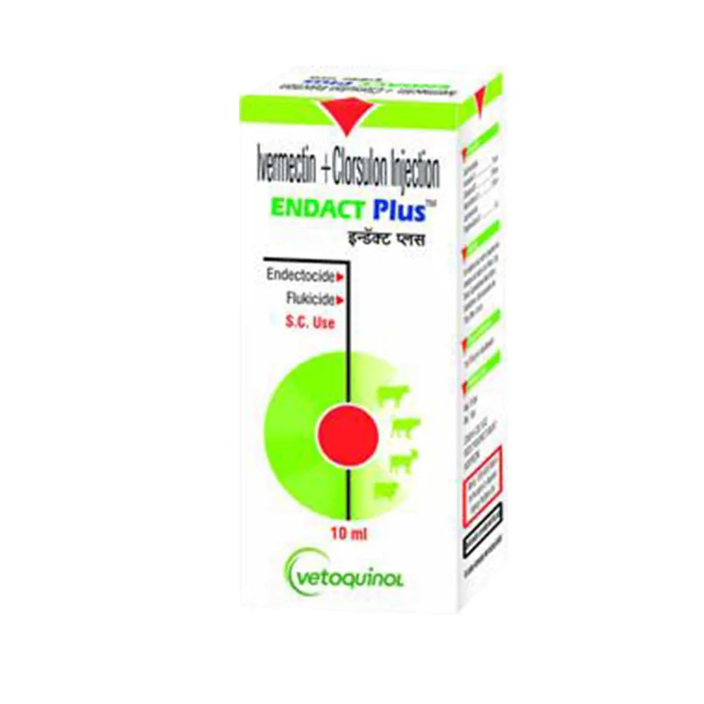 Ingredients Ivermectin I.P.: 1% w/v Clorsulon USP: 10% w/v Benzyl Alcohol I.P.: 1.5% v/v (as a preservative) Propylene Glycol I.P.: Ensures optimal formulation stability Advantages Comprehensive parasite control, including liver flukes, promoting the health of your livestock. Convenient packaging with a sterile needle for hassle-free administration. High-quality ingredients guarantee efficacy and safety for your animals. Usage Recommendations Adult Cattle, Buffalo, Sheep, and Goats Endact Plus is primarily designed for adult livestock in need of parasite control, including liver flukes. Young Animals (Calves, Lambs, and Kids) It can also be used in young animals, but dosage adjustments are necessary depending on their age and body weight. Always consult a veterinarian for proper dosing in younger animals. Not Suitable For Non-lactating animals, unless specified for treatment. Animals in critical condition or with known hypersensitivity to ivermectin or clorsulon. Composition Breakdown Ivermectin I.P.: Effective against a wide range of parasites. Clorsulon USP: Specifically targets liver flukes for comprehensive parasite control. Benzyl Alcohol I.P.: Preserves the integrity of the solution. Propylene Glycol I.P.: Ensures formulation stability. Directions for Use Administer 1 ml per 50 kg body weight via the subcutaneous route. Each pack includes a 10 ml vial with a disposable syringe and needle for convenient dosing. Precautions: N/A