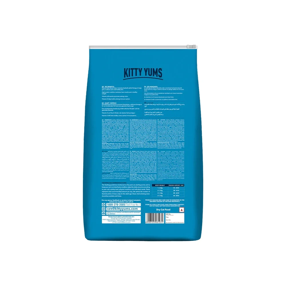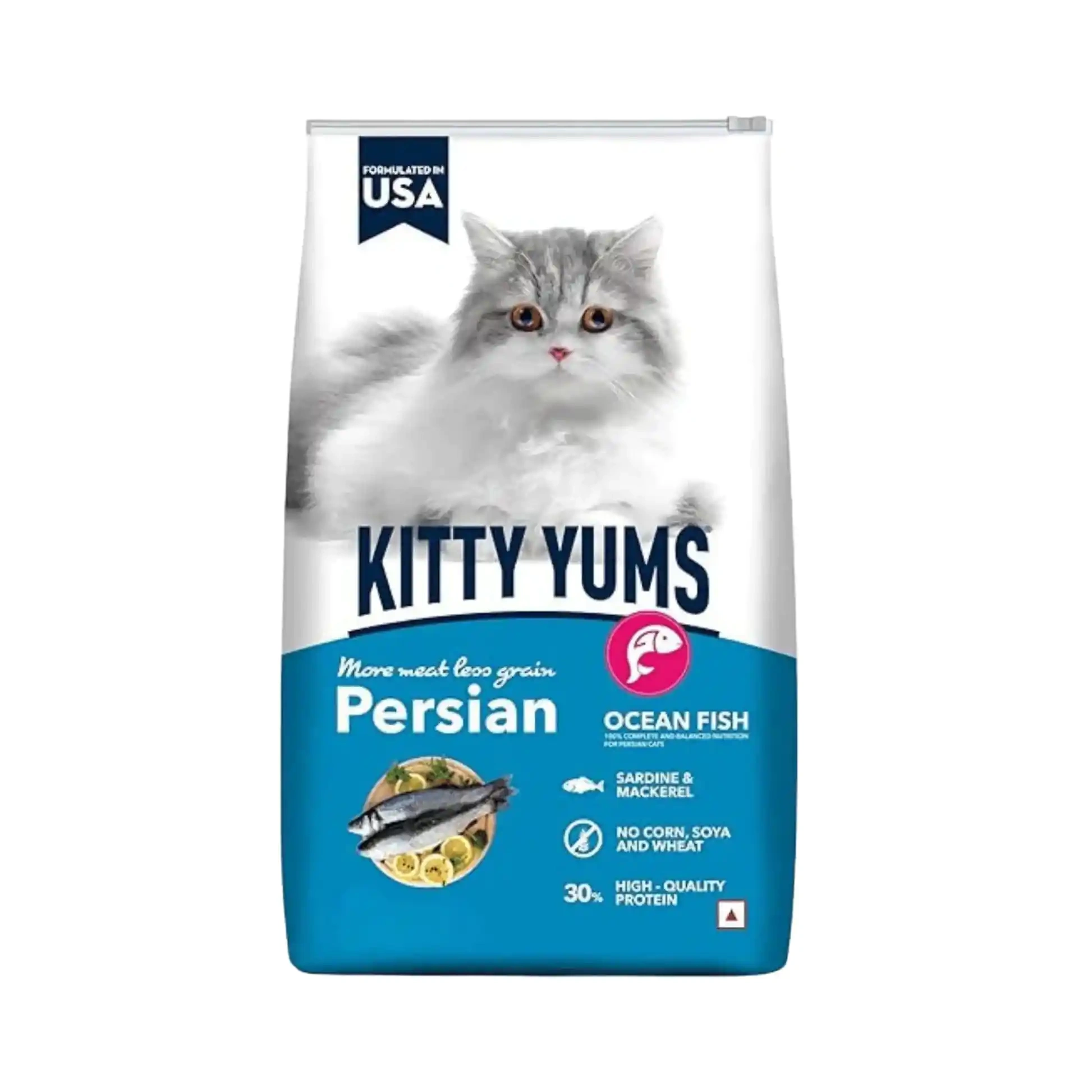 Kitty Yums Persian Ocean Fish Dry Cat Food is made of a natural fiber blend that helps minimize hairballs, and it’s a fully balanced diet that contains vitamins E and A as well as taurine, which helps improve the immune system. Fatty acids like Omega 3 and Omega 6 help give your cat a radiant coat and healthy skin. High protein nutrition helps maintain lean muscle mass and a healthy weight. Plus, this food doesn’t contain any corn, soya, or wheat – the main ingredients are ocean fish, Sardine and Mackerel.