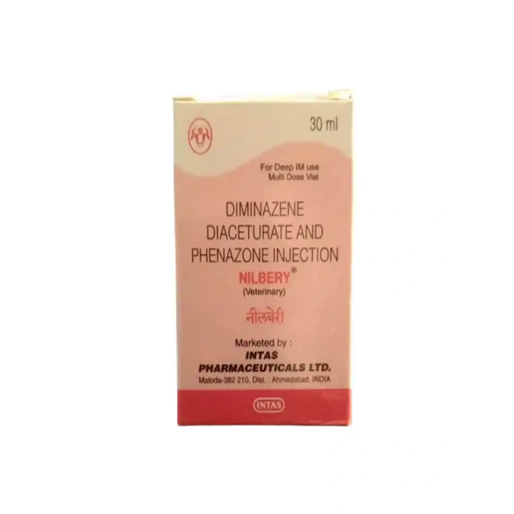 Nilbery Injection (Diminazine Diaceturate + Phenazone) is a high-quality injectable solution formulated for veterinary use. It is primarily indicated for the treatment and control of parasitic infections, such as Trypanosomiasis and Babesiosis, as well as for managing mixed haemoprotozoal infections and pyrexia of unknown origin (PUO). Available in 30ml and 90ml vials, it ensures precise and effective treatment for livestock and companion animals.