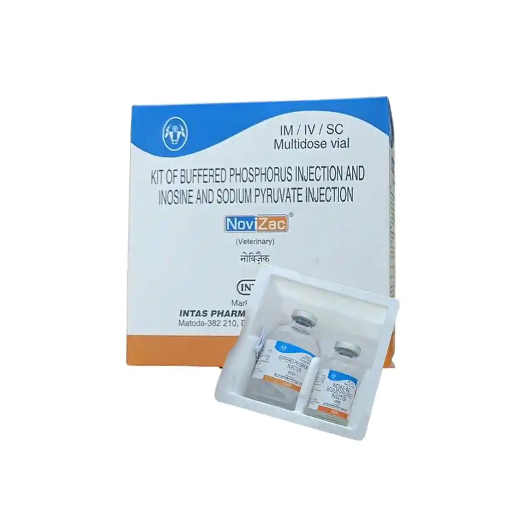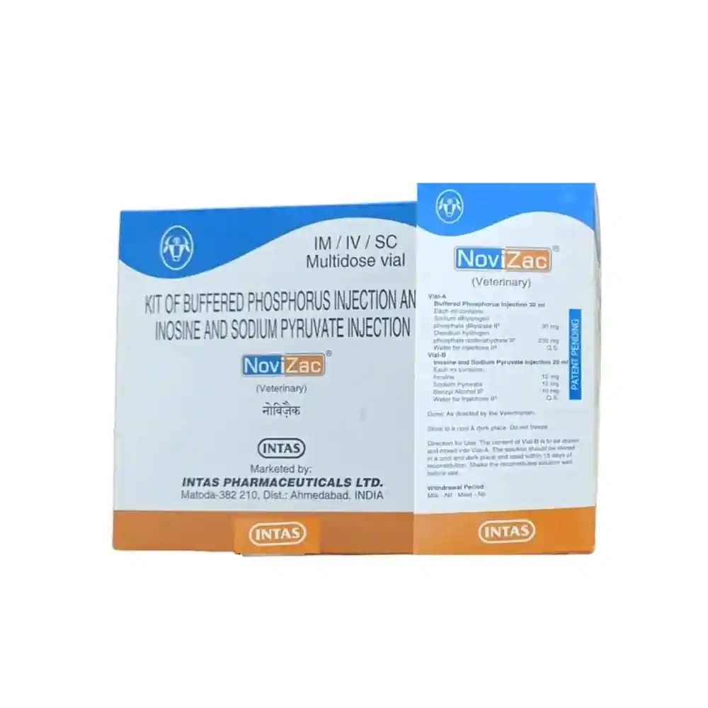 Detailed Description: NoviZac Injection comprises a two-vial combi-kit designed to provide complete nutritional and metabolic support for animals. The advanced formulation includes essential phosphates, inosine, and sodium pyruvate, which work together to enhance reproductive health, address metabolic disorders, and support recovery from malnutrition and debility.