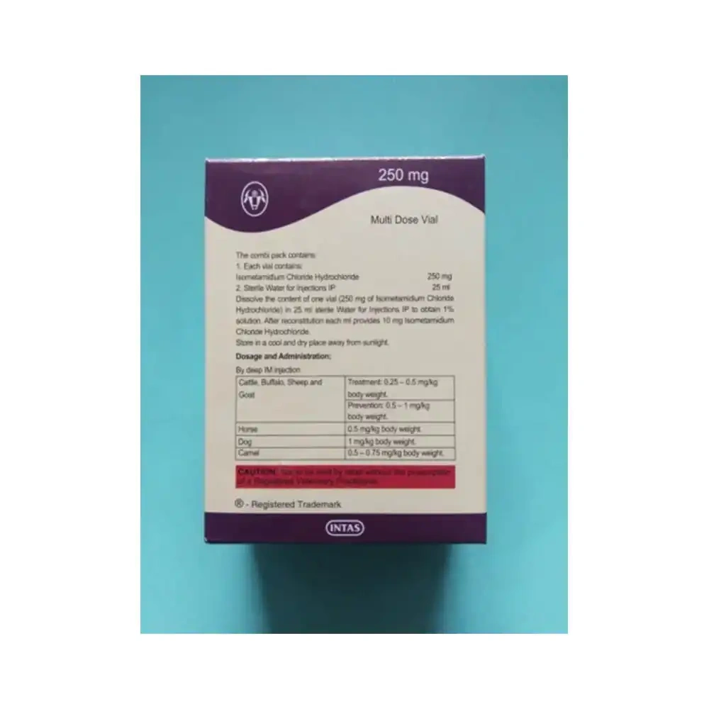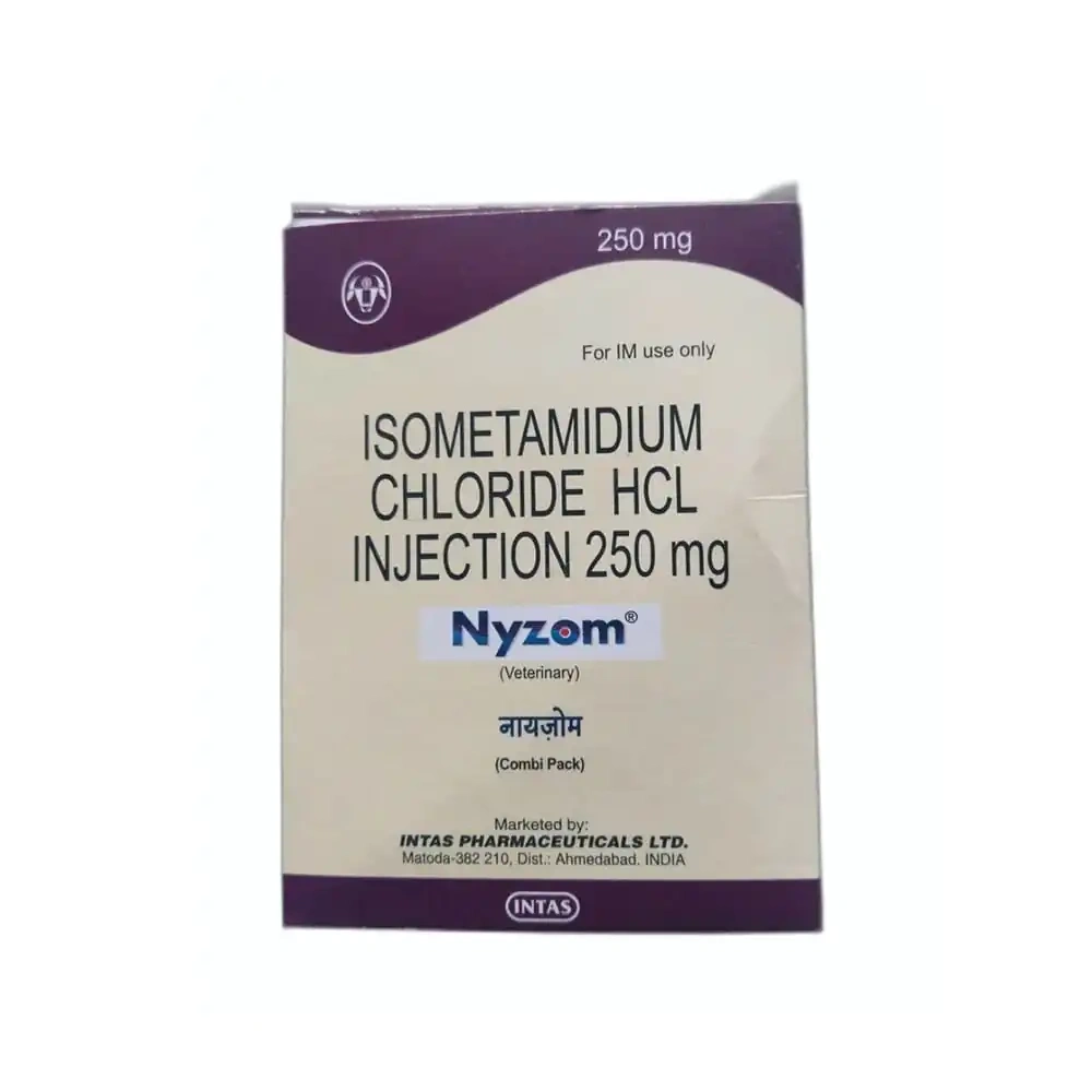 Introducing NYZOM INJ, a highly effective veterinary medicine designed for the treatment and prevention of trypanosomiasis in a range of animals including cattle, goats, sheep, camels, horses, and dogs. This product, featuring the active ingredient Isometamidium chloride HCl 250 mg, is a testament to the commitment to providing quality healthcare solutions for various animal species.
