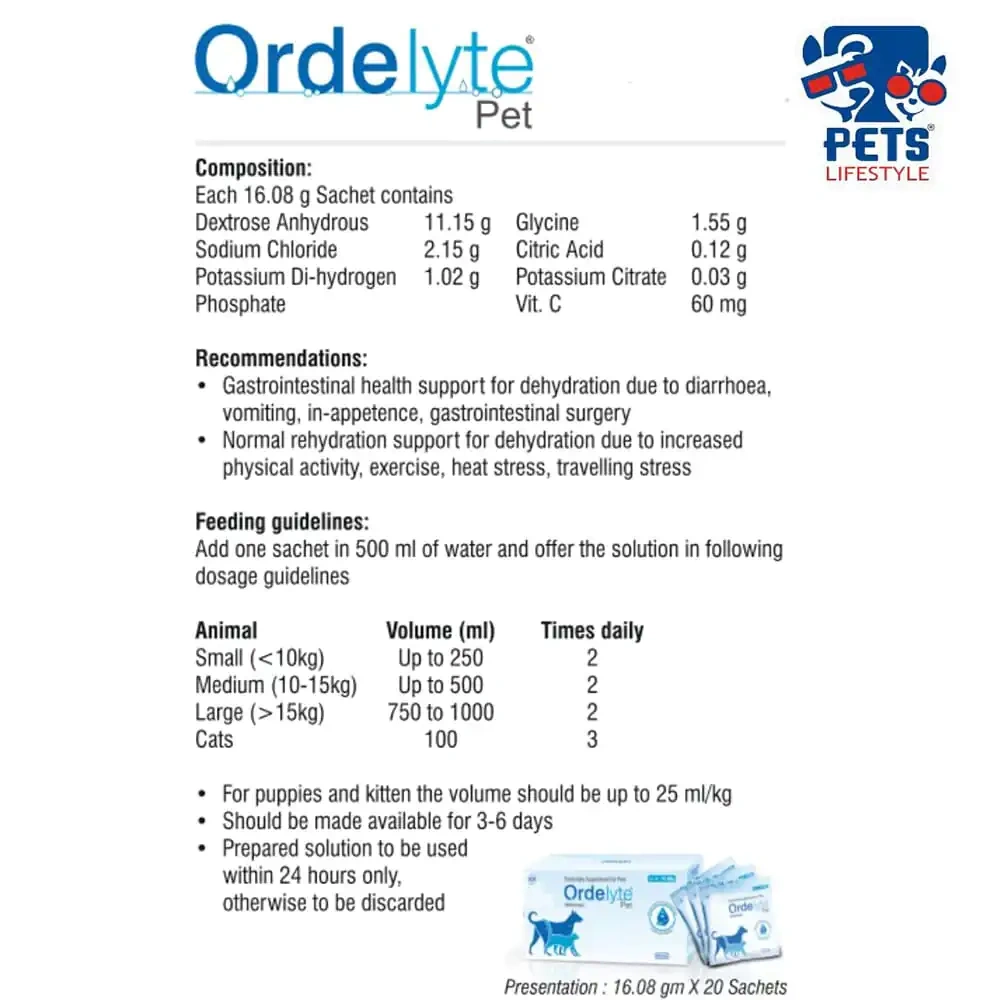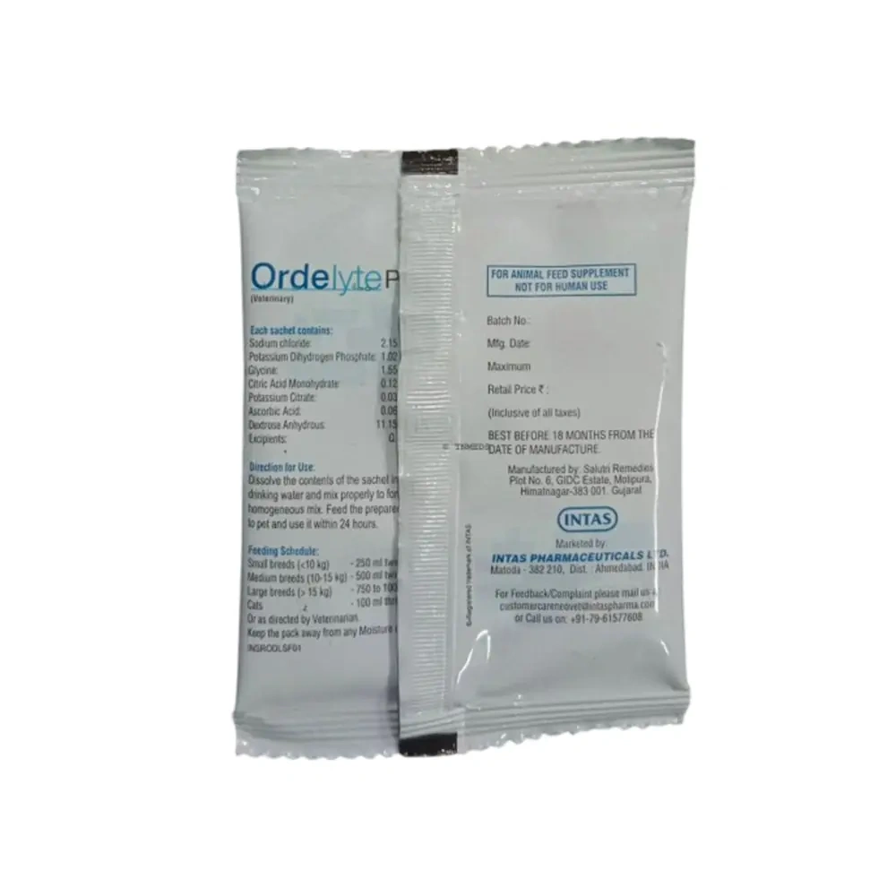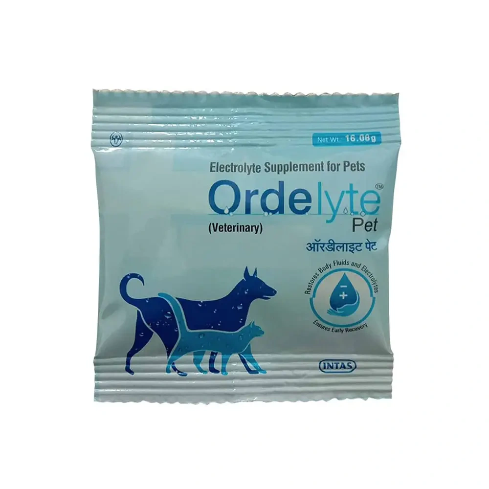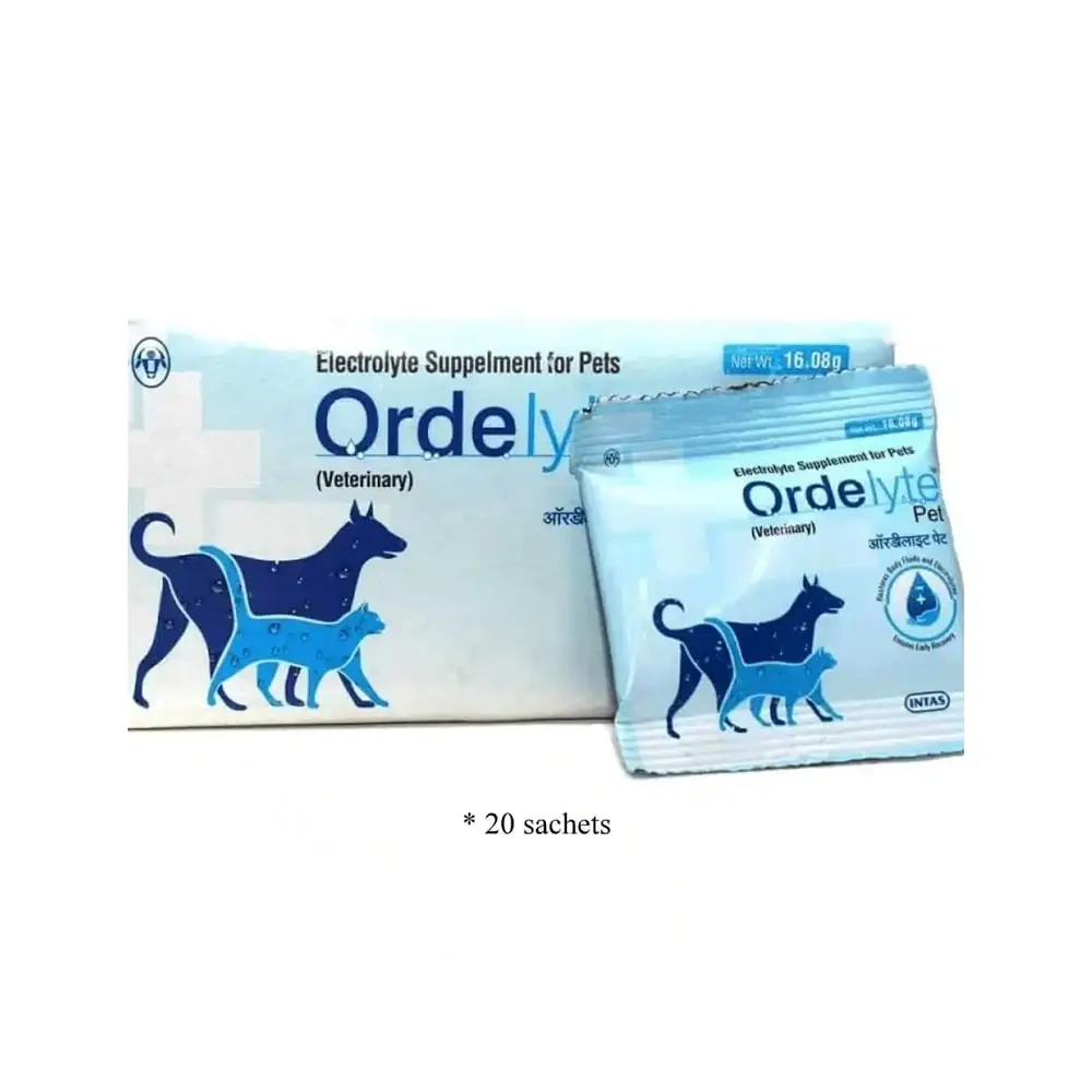 Introducing ORDELYTE PET POWDER, an exceptional IMMUNITY SUPPLEMENT from INTAS, specifically formulated for dogs and cats. This 16.08gm powder supplement is a balanced blend of electrolytes and nutrients, designed to support gastrointestinal health and hydration in pets. ORDELYTE PET POWDER, reflecting our commitment to providing high-quality health products for your beloved pets.