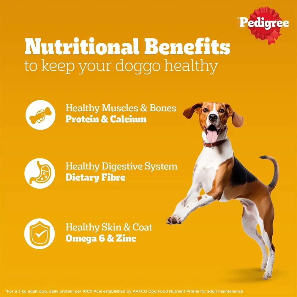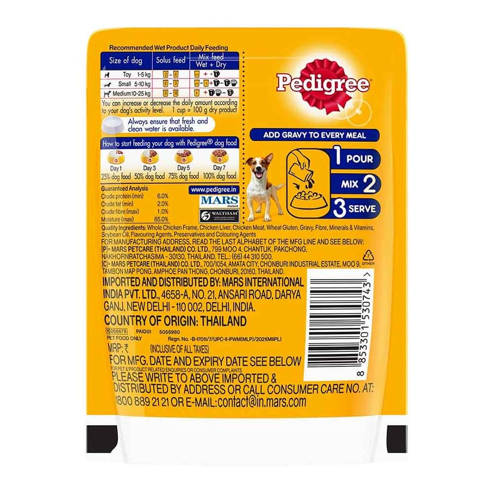 Main Ingredients and Use Pedigree Adult Wet Dog Food, Chicken and Liver Chunks in Gravy is made with real meat and high quality protein ensures that your dog is happy and supports their well-being. This exciting meal is packed with gravy, licious chicken and liver chunks that your furry companion will love. Packed with essential nutrients, it is a 100% complete and balanced meal that provides your dog with all the nutrients to stay healthy and strong. Protein and Calcium support healthy muscles and bones while Dietary Fibre supports a healthy digestive system. Omega 6 and Zinc help keep your dog’s skin and coat healthy. The water content in the meal ensures your dog is well-hydrated. Key Features Complete and Balanced Dog Food: Pedigree Wet Dog Food is a 100% complete and balanced meal for adult dogs. Delicious Flavour: Pedigree Adult Wet Dog Food, Chicken and Liver Chunks in Gravy, is made with real meat, high quality protein and contains a gravy licious flavour. Quality Ingredients: Quality ingredients ensure your dogs are healthy and energetic. Hydrating Food: The high moisture content in this food ensures healthy hydration for your furry friend. Health benefits: Protein and Calcium supports healthy muscles and bones while Dietary Fibre supports a healthy digestive system. It also contains Omega 6 and Zinc for healthy skin and coat health. Key Ingredients Chicken meat, Starch (Tapioca, Corn), Glycerine, Soy protein, Emulsifier, Sunflower oil, Gum, Salt, Flavours, Preservatives, Colouring. Benefits Soft and shiny skin and coat: Contains special vegetable oils for healthy skin and coat. It contains a special blend of: Linoleic Acid (Omega 6)b) Zinc for healthy skin and lustrous coat. Good digestive health: Pedigree has excellent digestibility: ~ 85%: Fibre from vegetables and cereals for bowel movement. Result in smaller and firmer stools. Healthy bones and teeth: The new Pedigree contains optimal Calcium levels and right ratio for Ca : Pb. Kibble design: for chewing and mouth feel – good for dental health. Better immunity: Good source of natural Taurine and other Antioxidants which comes from (fresh) meat. Vitamin E which helps in strengthening the dog’s immune system. Precautions N/A Direction of Use Use as prescribed by Veterinarian.