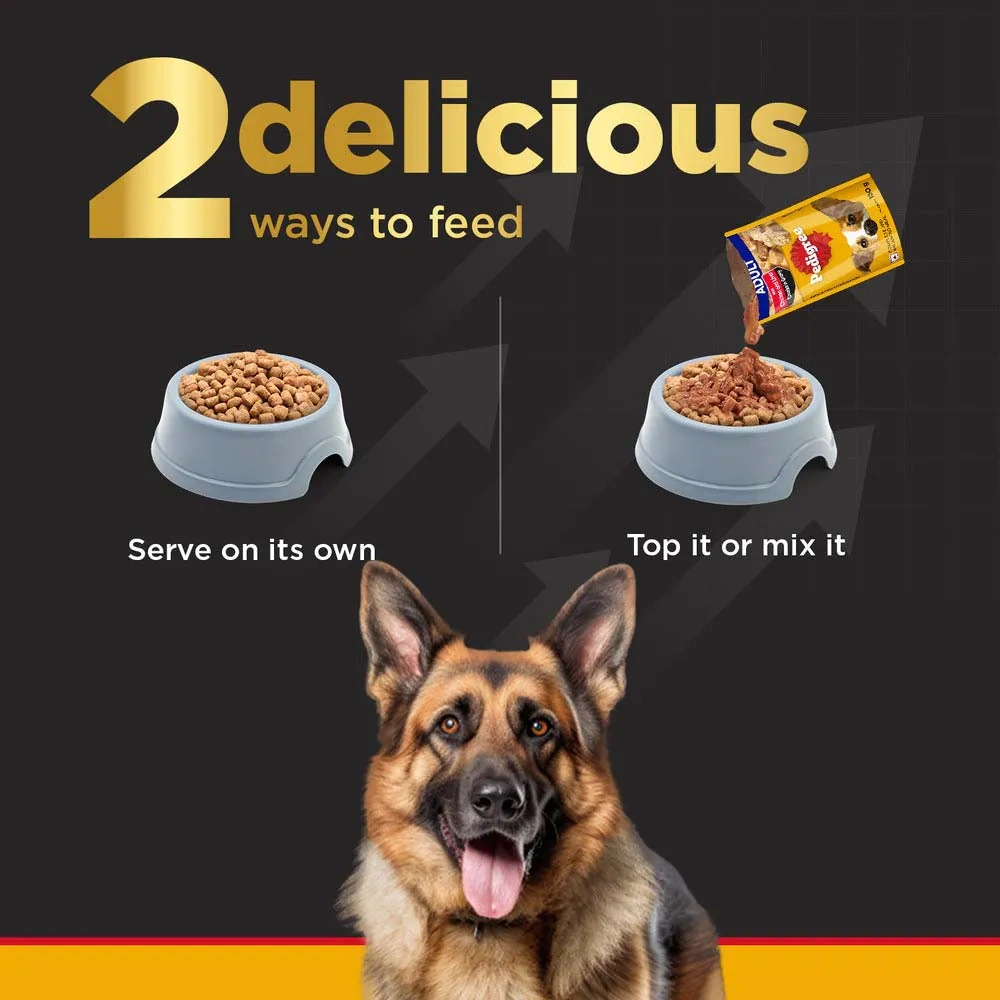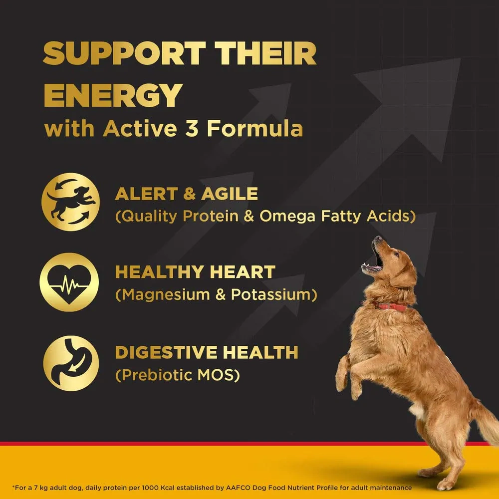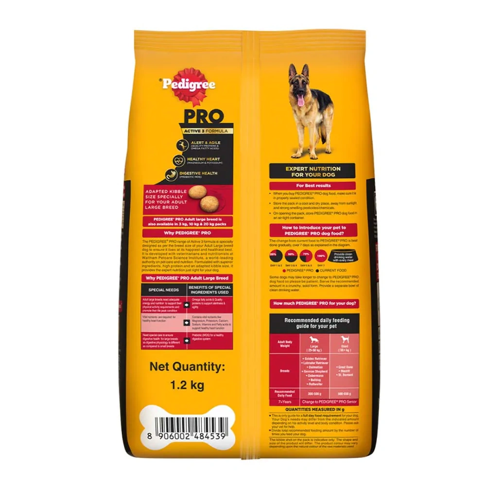 Main Ingredients and Use Pedigree PRO adult dog food provides the expert nutrition just right for your dog. It contains 33% more nutrients supporting your dog’s overall well-being. Quality proteins and omega fatty acids contribute to alertness and agility, while vital nutrients such as magnesium, potassium, calcium, sodium, vitamins, and fatty acids support a healthy heart. This dog food also contains prebiotics (MOS) to support digestive health in dogs. Key Features Adapted Kibble Size: Pedigree PRO Dry Dog Food for Adult Large Breed Dogs is packed with specially designed adapted kibbles. Superior Ingredient: It is formulated with superior ingredients and high protein, for your dog’s overall well-being. Expert Nutrition: Pedigree PRO adult dog food contains 33%* more nutrients (*Compared to Pedigree Adult Chicken and Veg Dry Dog Food). Active 3 Formula: Quality proteins and omega fatty acids support alertness and agility in dogs. Magnesium and potassium support heart health while prebiotics (MOS) support digestive health. Suitable For: This Pedigree PRO dog food is suitable for adult large breed dogs (18 months onwards). Key Ingredients Cereals and cereal by-products, Chicken and chicken by products, Meat and meat by-products, Vegetable by-products and proteins, Vegetable oils, Chicken liver powder, MOS, Milk powder, Iodised salt, Essential vitamins and minerals, Permitted preservatives, Antioxidants and flavours. Benefits Tailored Nutrition: Formulated for large breed dogs aged 18 months and older with active lifestyles. High-Quality Protein: Supports muscle maintenance and overall vitality. Joint Health Support: Includes nutrients to promote joint health and mobility. Digestive Health: Contains a balanced blend of fibers and prebiotics for optimal digestion. Immune System Boost: Enriched with vitamins and antioxidants to support a healthy immune system. Dental Health: Crunchy kibble helps reduce tartar buildup and promotes oral health. Great Taste: Formulated to appeal to the taste preferences of large breed dogs. Precautions When you buy Pedigree dog food, make sure it is Properly sealed. On opening the pack, store Pedigree dog food in an air-tight container, in a cool and dry place, away from sunlight. Refer to the back of the pack for more information. Direction of Use Use as prescribed by Veterinarian.