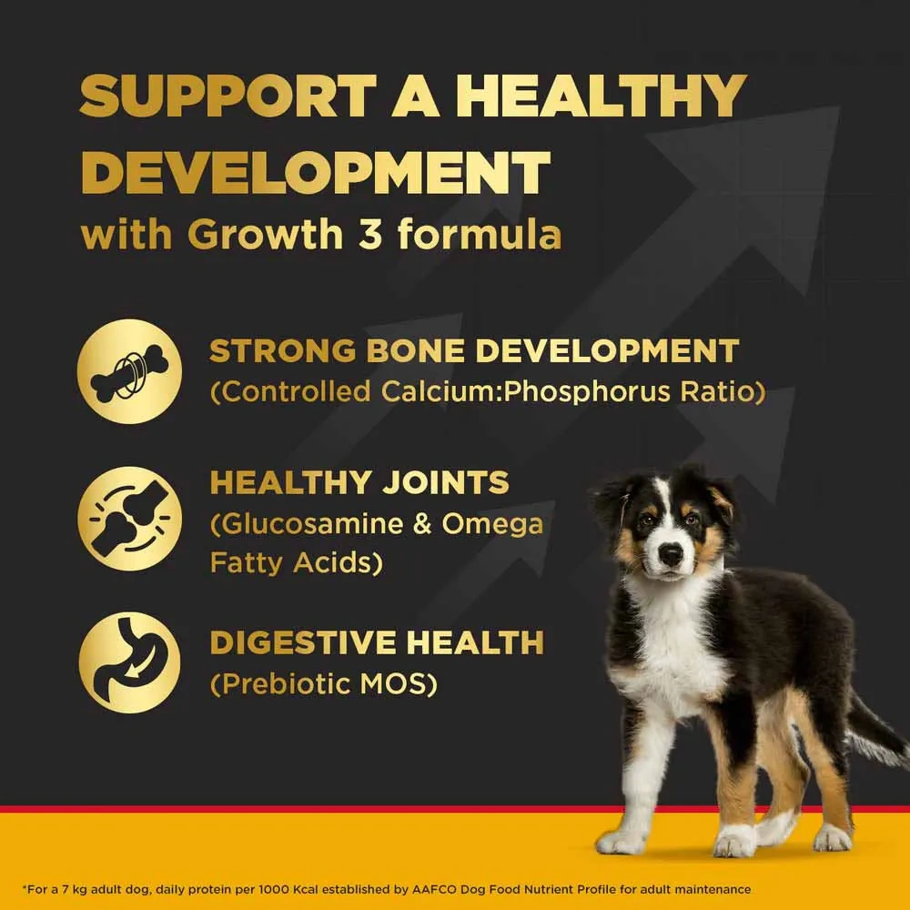 Growth 3 Formula: A controlled Ca:P ratio ensures healthy bone development. Glucosamine and omega fatty acids support healthy joints. Prebiotics (MOS) support digestive health.