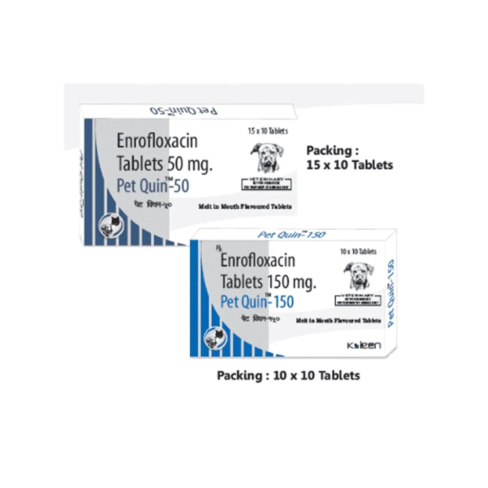 Indications (for Dogs and Cats): PetQuin tablets are indicated for the treatment of bacterial infections in: Alimentary, respiratory, and urogenital tracts Skin and secondary wound infections Otitis externa Dosage and Administration: Dosage: 5 mg/kg body weight Frequency: Once daily (or can be divided into two doses given twice daily) Duration: 3 to 10 days, with or without food Directions for Use: Use only as prescribed by the veterinarian. Precautions: Age Restrictions: Dogs: Not recommended for dogs under 1 year of age (for large breeds, under 18 months) Cats: Not recommended for cats under 8 weeks of age Special Considerations: Safety in breeding and pregnant animals has not been established. Use with caution in epileptic animals. Drug Interactions: Concurrent use with ciclosporin may reduce metabolism and increase the risk of nephrotoxicity. Not for human use. For veterinary treatment only.