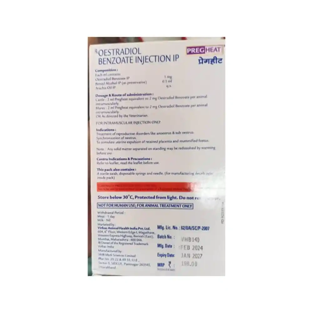 Cattle : 2 ml Pregheat equivalent to 2 mg Oestradiol Benzoate per animal intramuscularly.