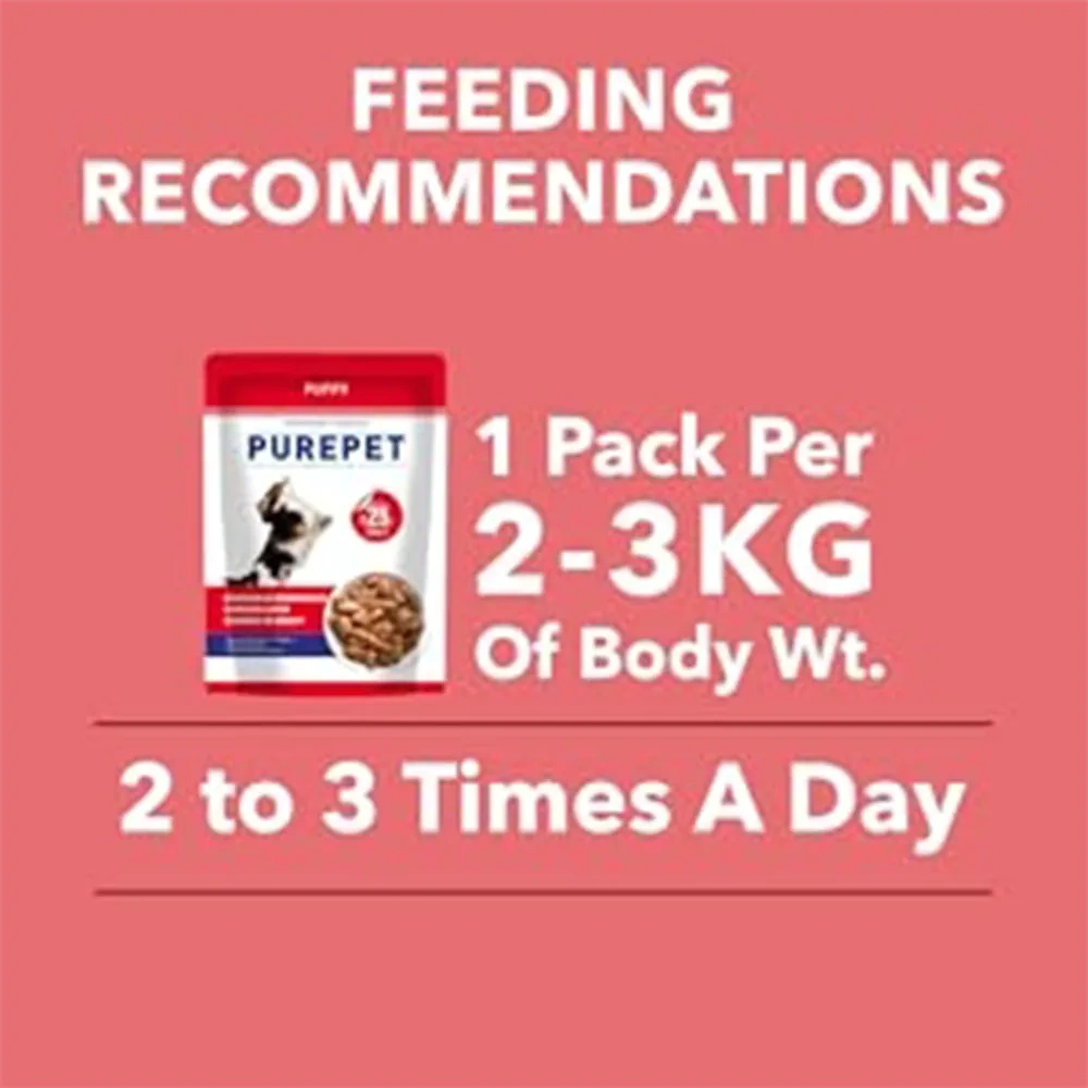 Purepet Chunks Gravy Food is made with real chicken, hydrolysed chicken liver, and eggs, providing high-quality protein that supports muscle growth and overall development for puppies.