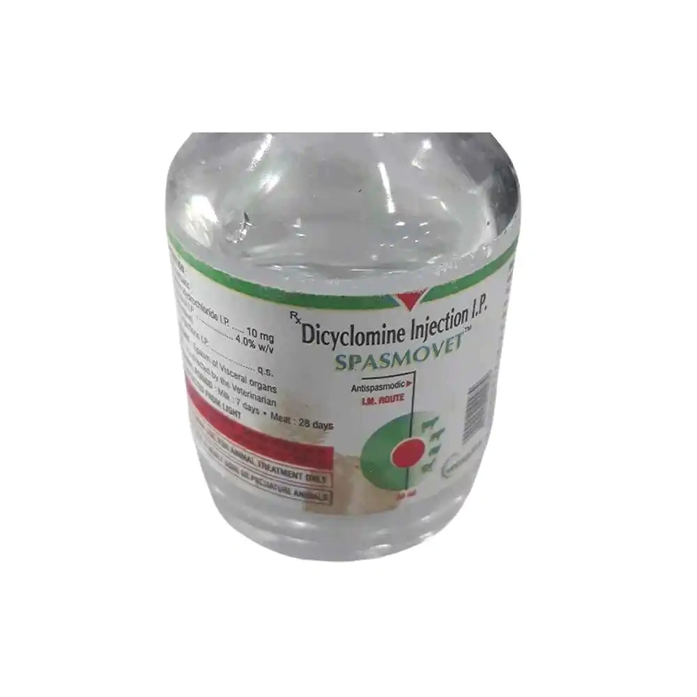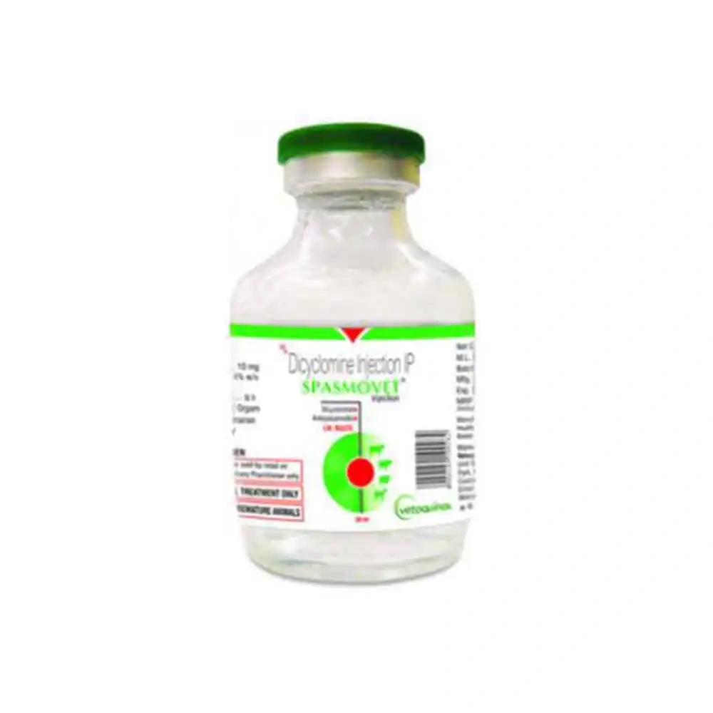 SPASMOVET INJ contains Dicyclomine Hydrochloride (10 mg/ml), a muscle relaxant that alleviates abdominal pain and intestinal colic in animals. It effectively reduces spasms in the gastrointestinal and urinary tract, making it a trusted veterinary solution.