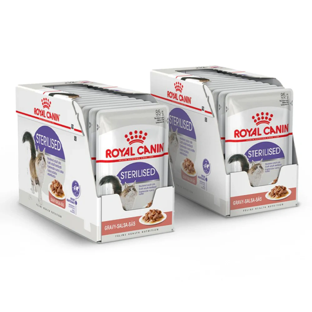 ROYAL CANIN® Sterilised in Gravy is a wet food formulated to meet the nutritional needs of neutered adult cats. It helps maintain an ideal weight with controlled energy content and moderate fat levels. The carefully balanced formula also supports a healthy urinary system, reducing the risk of urinary stones, while matching the optimal macro nutritional profile instinctively preferred by adult cats.