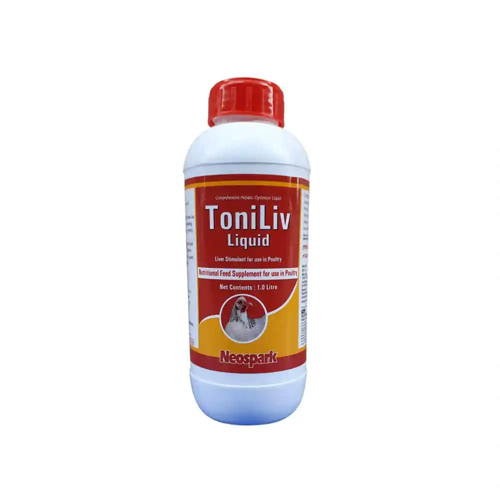 Composition ToniLiv Liquid contains Tricholine citrate, Protein Hydrolysate, Vitamin B12, Inositol, Methyl donors, Selenium, Vitamin-E, Biotin, Copper, Iron with herbal liver stimulants. Indications To stimulate and optimizes affected liver functions. To restore reduced feed intake due to conditions like hot weather, debeaking, vaccination, shifting, deworming Convalescence after disease, etc. To optimize the utilization of feed ingredients and to stimulate digestion. To improves FCR, growth, weight gain and egg production. Dosage Layers: 10 ml / 100 birds for 7 days as week a month programme Broilers: 10 ml / 100 birds for 2 days in a week from 3rd week Breeders: 25 ml / 100 birds Metabolic disorders: 20-30 ml / 100 birds for 5-7days Higher dosage may be used based on the need or as advised by Poultry Consultant. Directions for Use Use as prescribed by the doctor. Precautions N/A