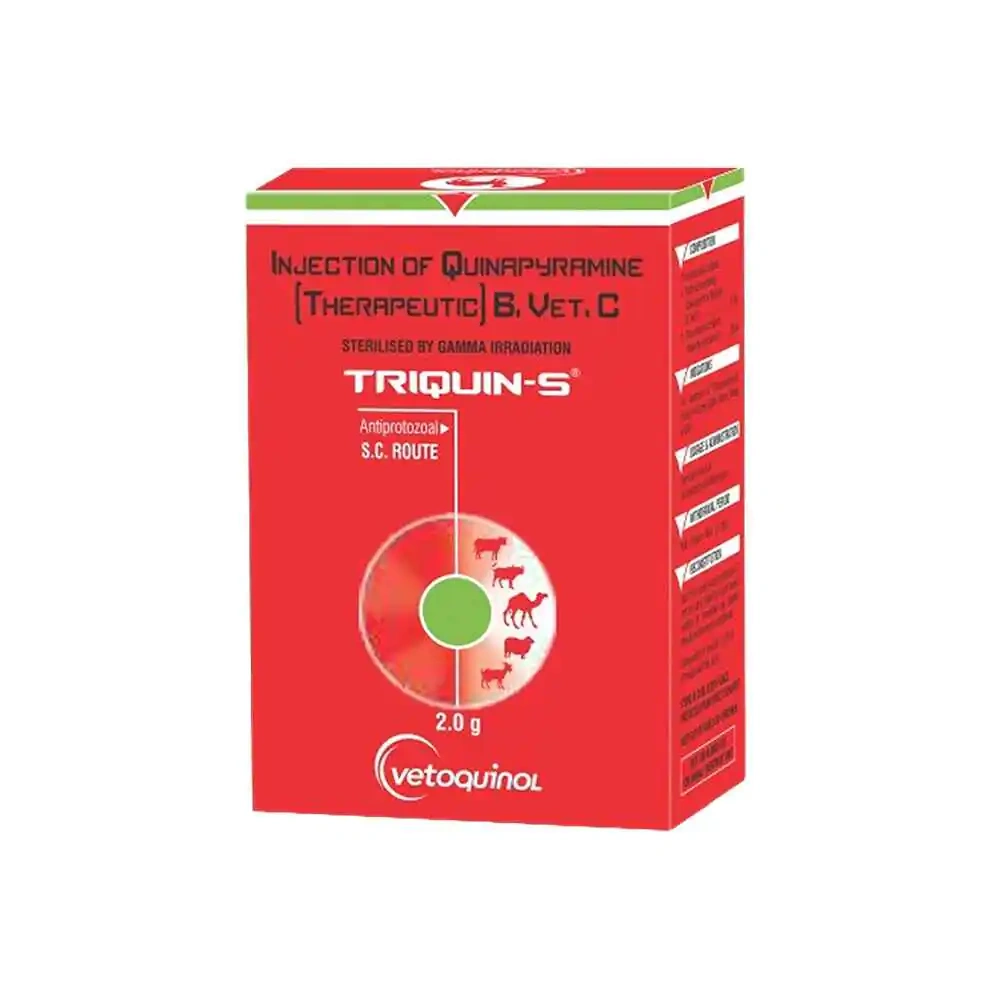 Triquin-S Injection is a potent solution formulated to treat Trypanosomiasis (Surra) in Camels, Cattle, Horses, Sheep, and Goats. It contains Quinapyramine sulphate (2.0 g), which serves as a reliable defense against parasitic infections affecting livestock.