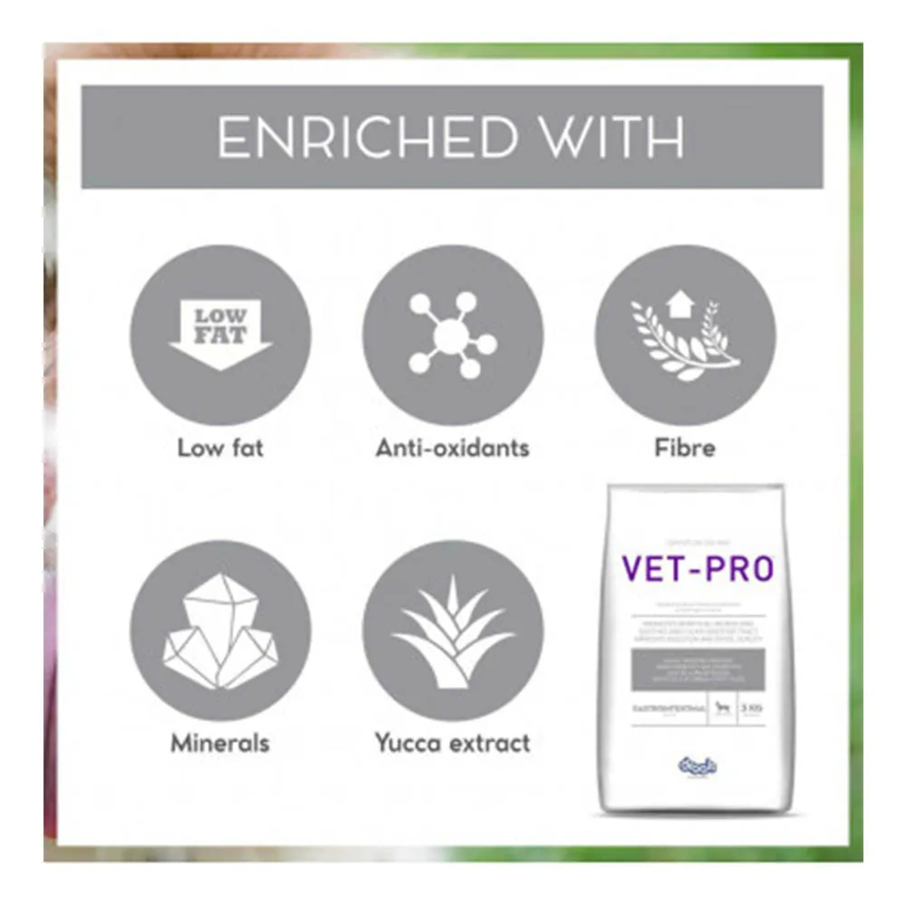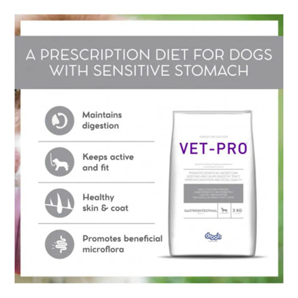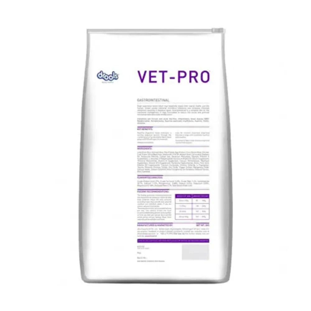 Drools Vet Pro Gastrointestinal Dry Dog Food is a specialized product formulated to support dogs with gastrointestinal issues or digestive sensitivities. Dogs experience stress which may negatively impact their overall health, just like humans. Stress causes intestinal microflora imbalance and increases intestinal movement resulting in digestive upset. This is a prescription diet for nutritional management of dogs formulated to reduce stress and promote nutritional restoration and digestive health. It provides complete and balanced nutrition, ensuring that dogs receive the necessary vitamins, minerals, and nutrients for their overall health while being gentle on their digestive system.