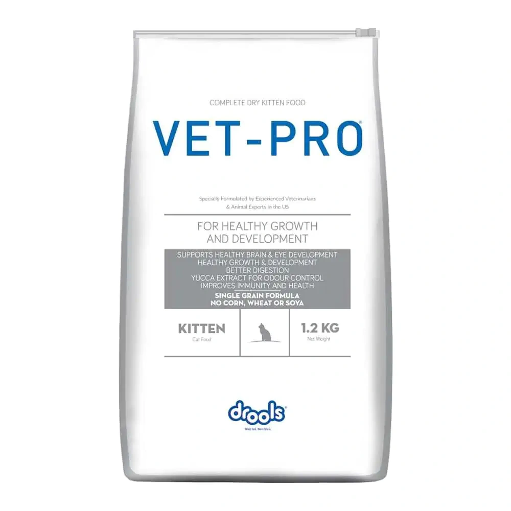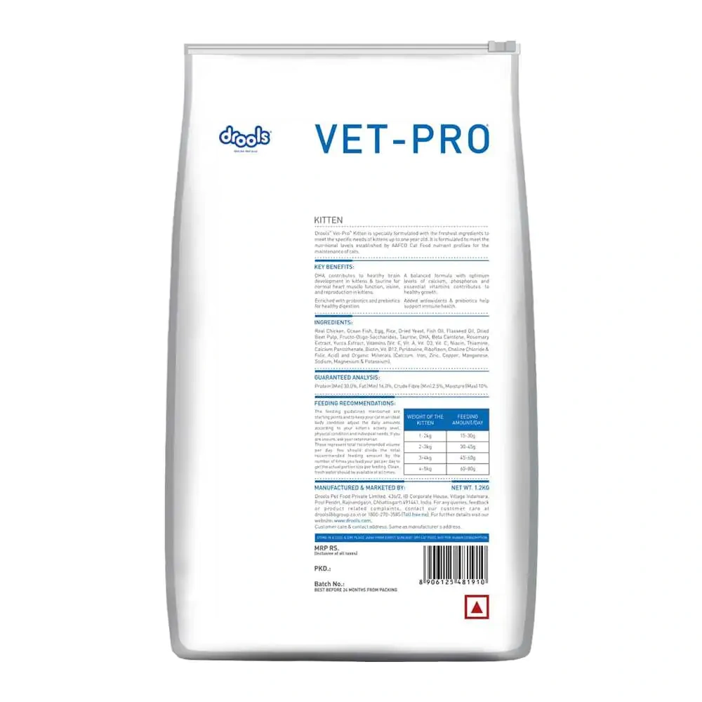 Drools Vet-Pro Kitten is specially formulated with the freshest ingredients to meet the specific needs of kittens up to one year old. It is formulated to meet the nutritional levels established by AAFCO Cat Food nutrient profiles for the maintenance of cats.