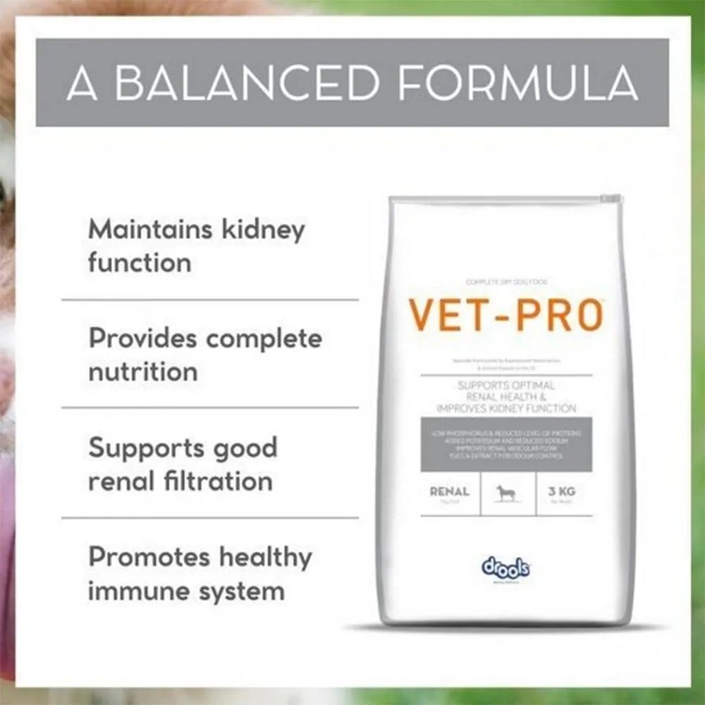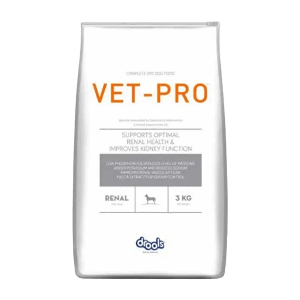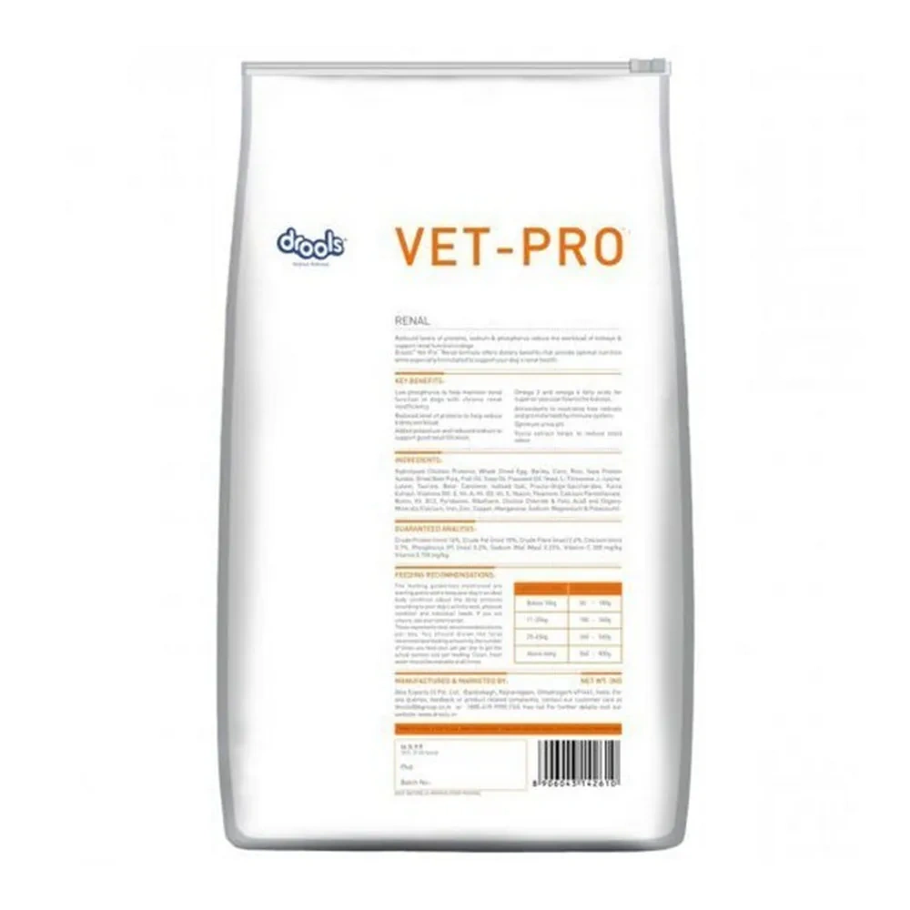Main Ingredients and Use Drools Vet-Pro Renal reduces levels of proteins, sodium and phosphorus, reduces the workload of kidneys and supports renal function in dogs. Its formula offers dietary benefits that provide optimal nutrition while especially formulated to support your dog’s renal health. Key Features High-Quality Protein: Supports muscle maintenance with minimal kidney stress. Reduced Sodium: Lowers blood pressure and eases kidney workload. Antioxidants: Promote overall health and immune system function. Great Taste: Ensures palatability and encourages regular feeding. Key Ingredients Chicken Proteins, Whole Dried Egg, Barley, Corn, Rice, Soya Protein Isolate, Dried Beet Pulp, Fish Oil, Soya Oil, Flaxseed Oil, Yeast, L-Threonine, L-Lysine, Lutein, Taurine, Beta Carotene, Iodized Salt, Fructo-Oligo-Saccharides, Yucca Extract, Vitamins, Organic Minerals. Benefits Low phosphorus to help maintain renal function in dogs with chronic renal insufficiency. Reduced level of proteins to help reduce kidney work load. Added potassium and reduced sodium to support good renal filtration. Omega 3 and Omega 6 fatty acids for superior vascular flow to the kidneys. Antioxidants to neutralize free radicals and promote a healthy immune system. Optimum urine pH. Yucca extract helps to reduce stool odour. Precautions Store in a cool, dry place. Keep the package sealed to maintain freshness. Dosage Dose per day given on packet as per body weight: Below 10 kg: 50 to 180 gm. 11 to 25 kg: 180 to 360 gm. 25 to 45 kg: 360 to 560 gm Above 45 kg: 560 to 800 gm. Direction of Use Use as prescribed by the doctor.