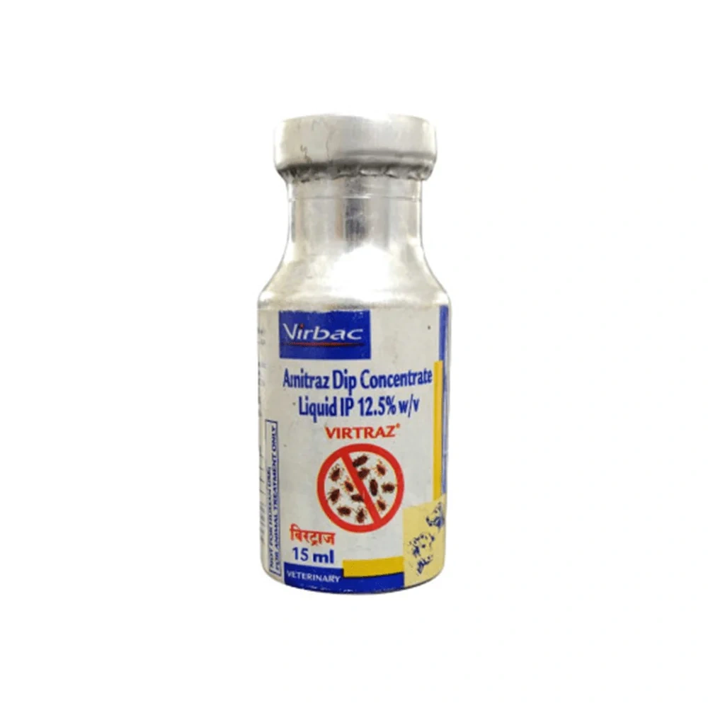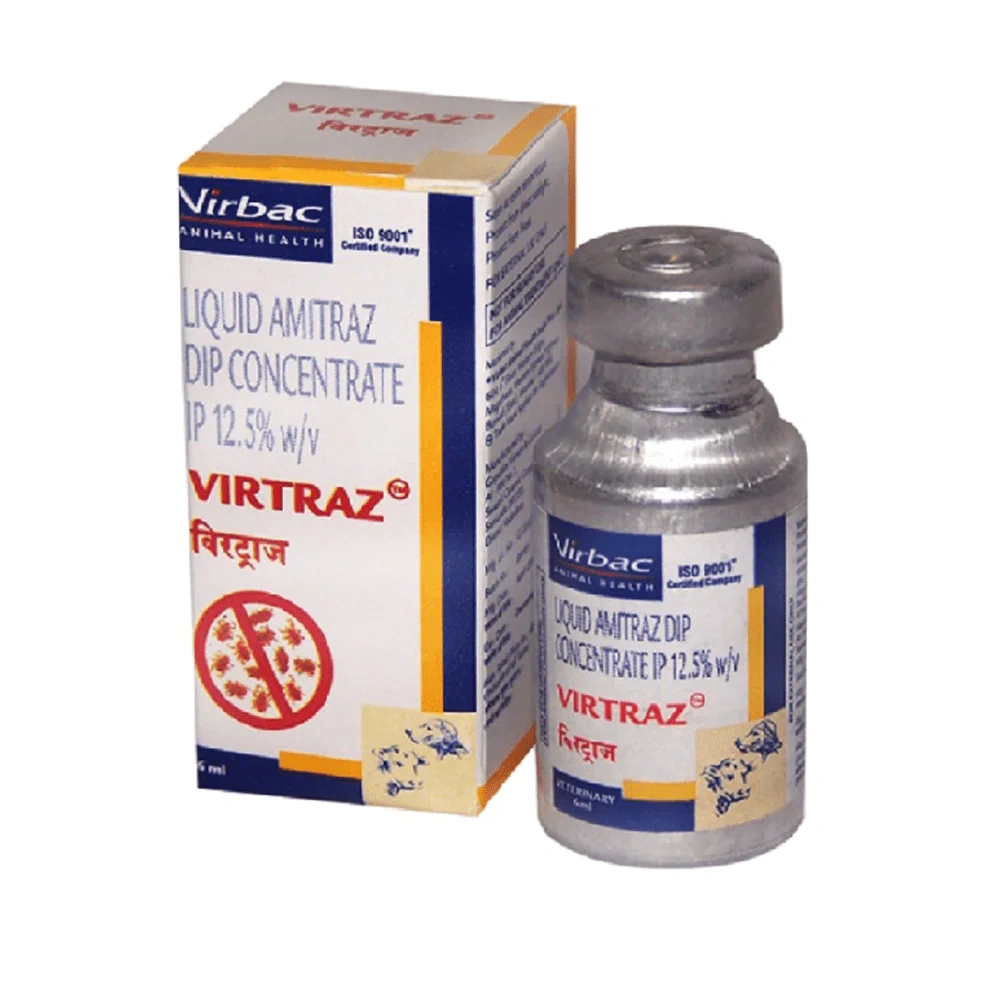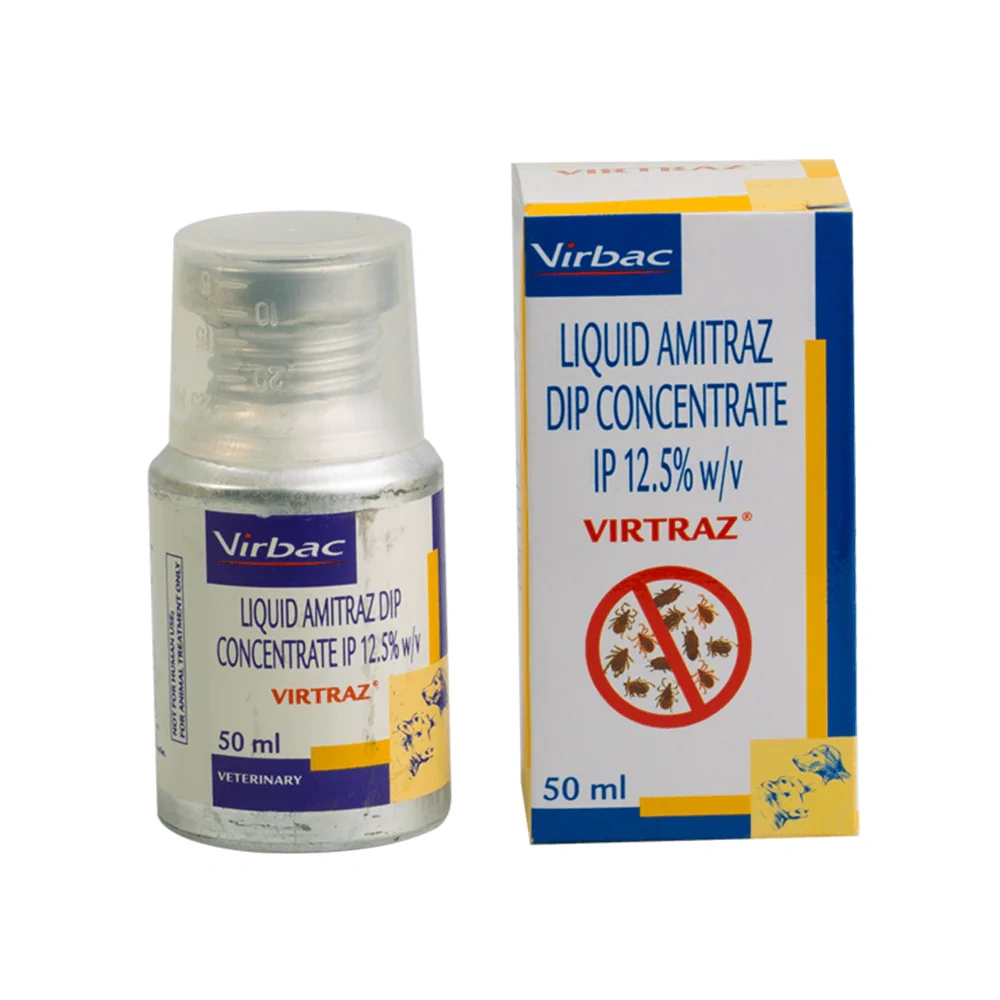 Virtraz® for prevention and treatment of Mange and Ectoparasitic Infestation. Recommendation for Registered Medical Practitioners. For prevention and control of ectoparasitic i. Composition: 15 ml Composition Amitraz 12.5% w/v Dosage and Direction for use: Large animal Tick control/ earsore/ Humpsore etc. 2 ml/litre of water Mites 3-4 ml/litre of water Dogs & Cats Ticks & fleas 2 ml/ litre of water Mites 3-4 ml/litre of water Application: One application per week Precautions: N/A