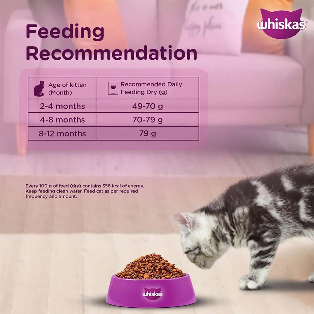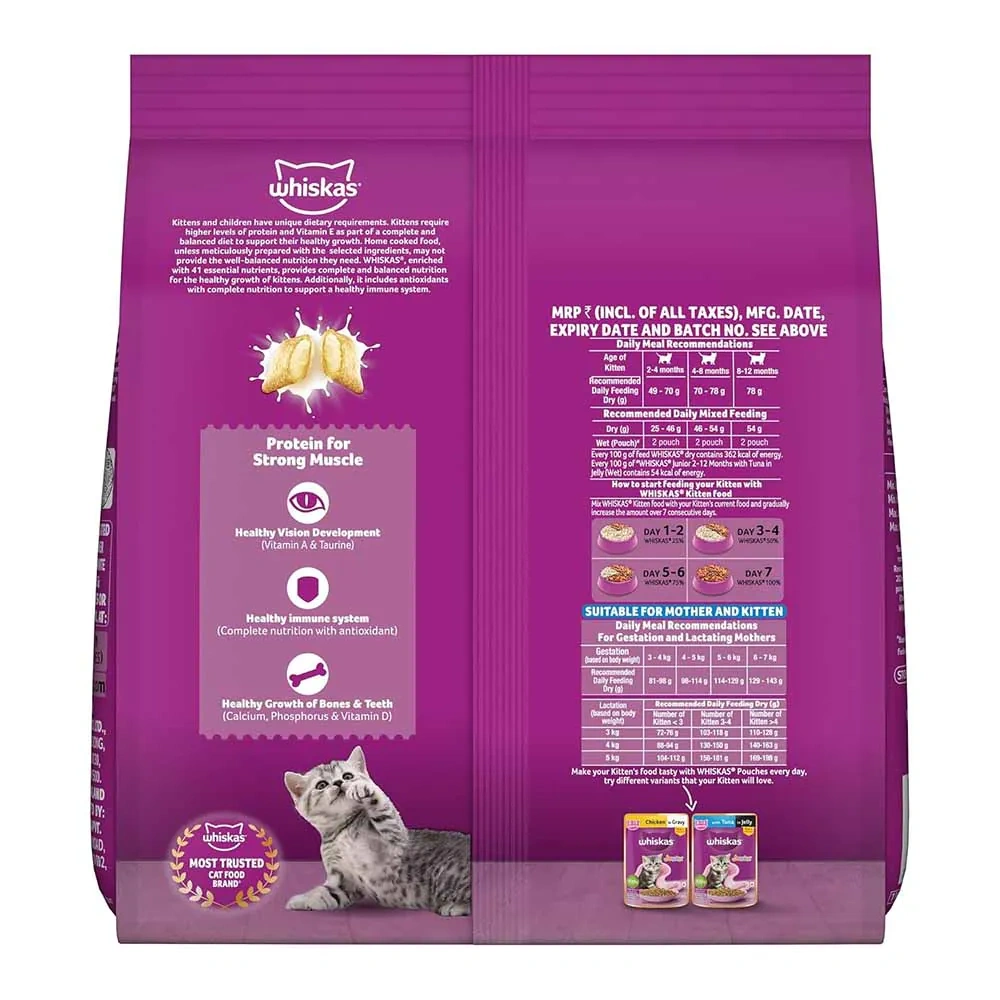 Suitable for All Kittens: Whiskas Kitten Dry Cat Food is suitable for kittens aged 2 to 12 months, providing them with the nutrition they need for optimal development. It’s also suitable for mother cats.