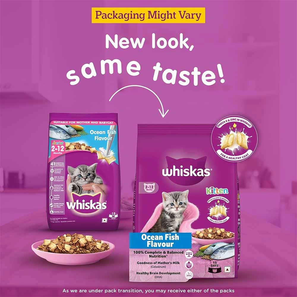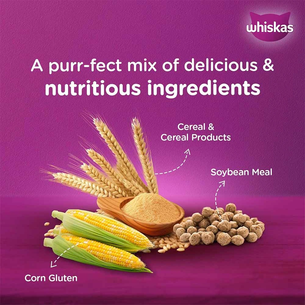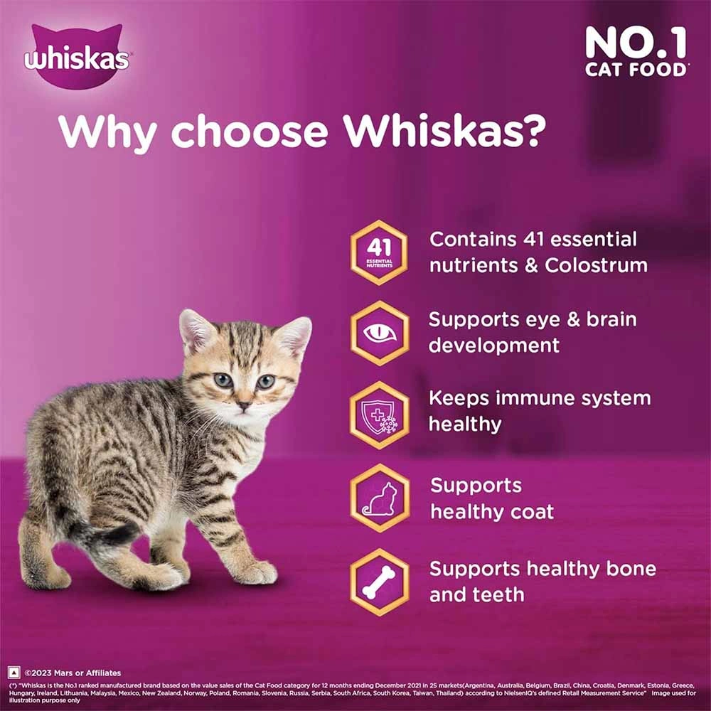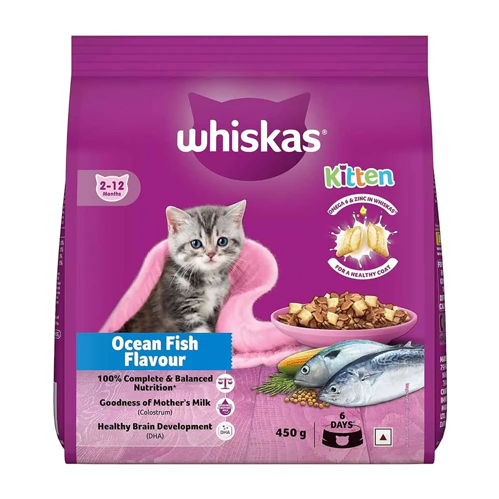 Delicious Ocean Fish Flavor: Whiskas Kitten Dry Cat Food delights your feline friend with nourishing crunchy chunks infused with the irresistible taste of ocean fish.