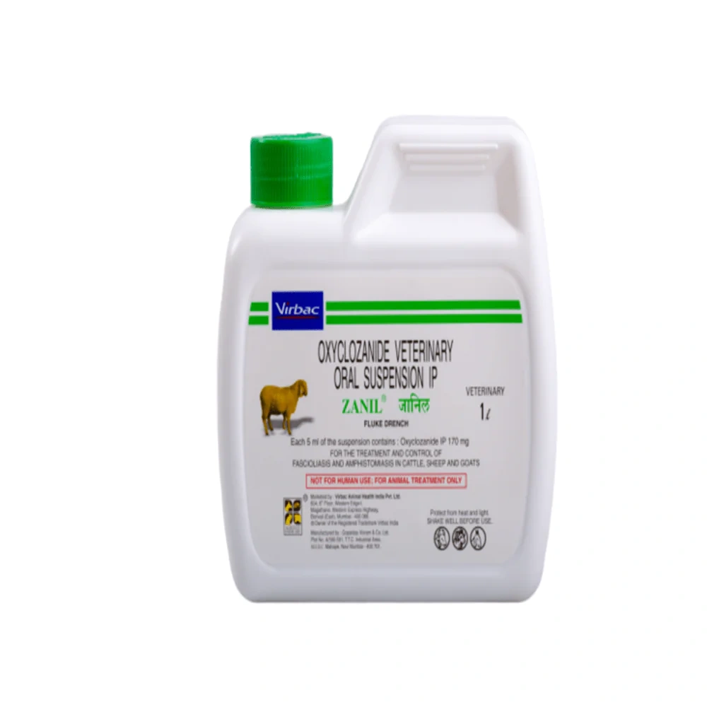 10 mg/kg of Oxyclozanide. Drench 30 ml of ‘ZANIL’ for alive weight of 100 kg and 15 ml of ‘ZANIL’ for every additional 50 kg of live weight upto a maximum of 150 ml.